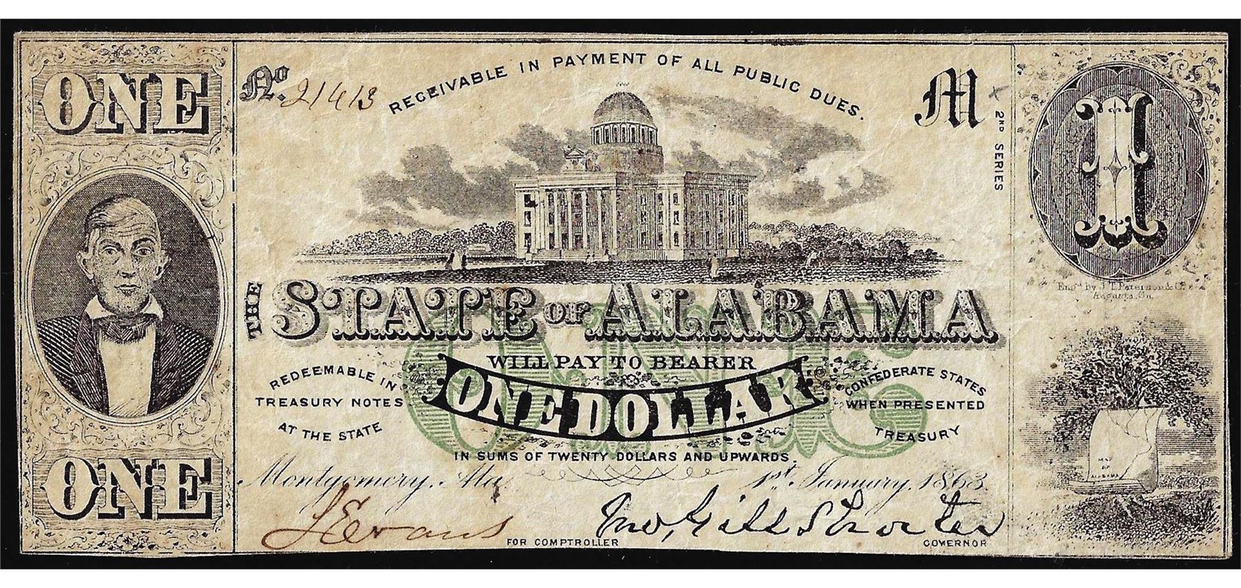 One 1863 $1 State of Alabama Obsolete Banknote.