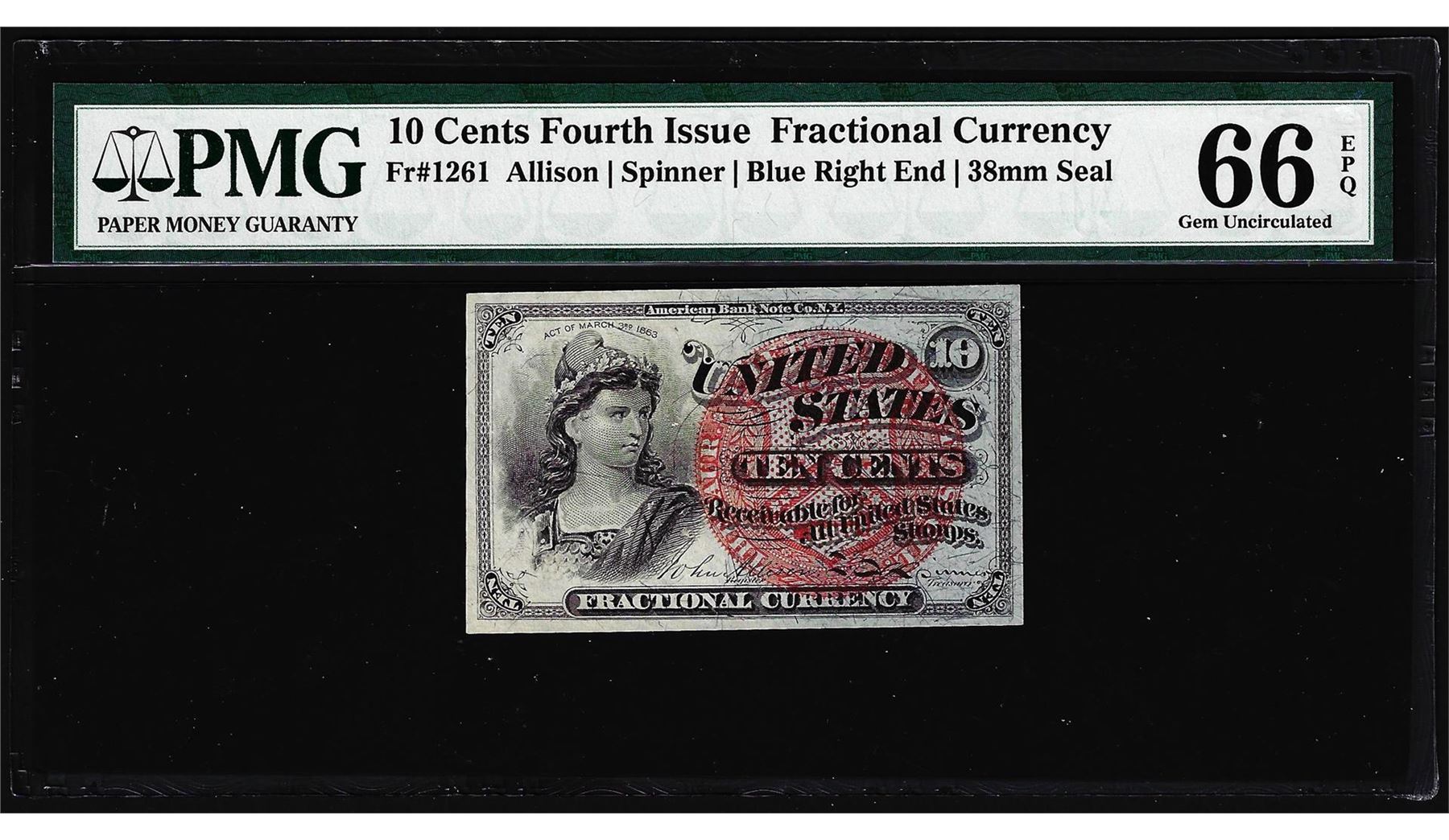 One 1863 10 Cent 4th Issue Fractional Currency Note Fr.1261 PMG Choice Uncirculated 66EPQ. PMG Certified.