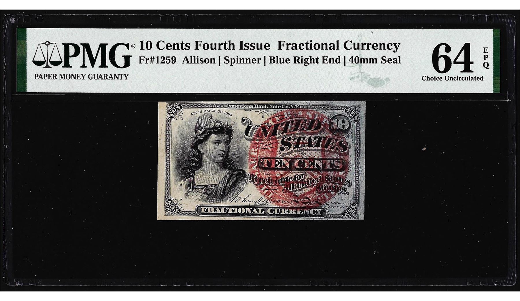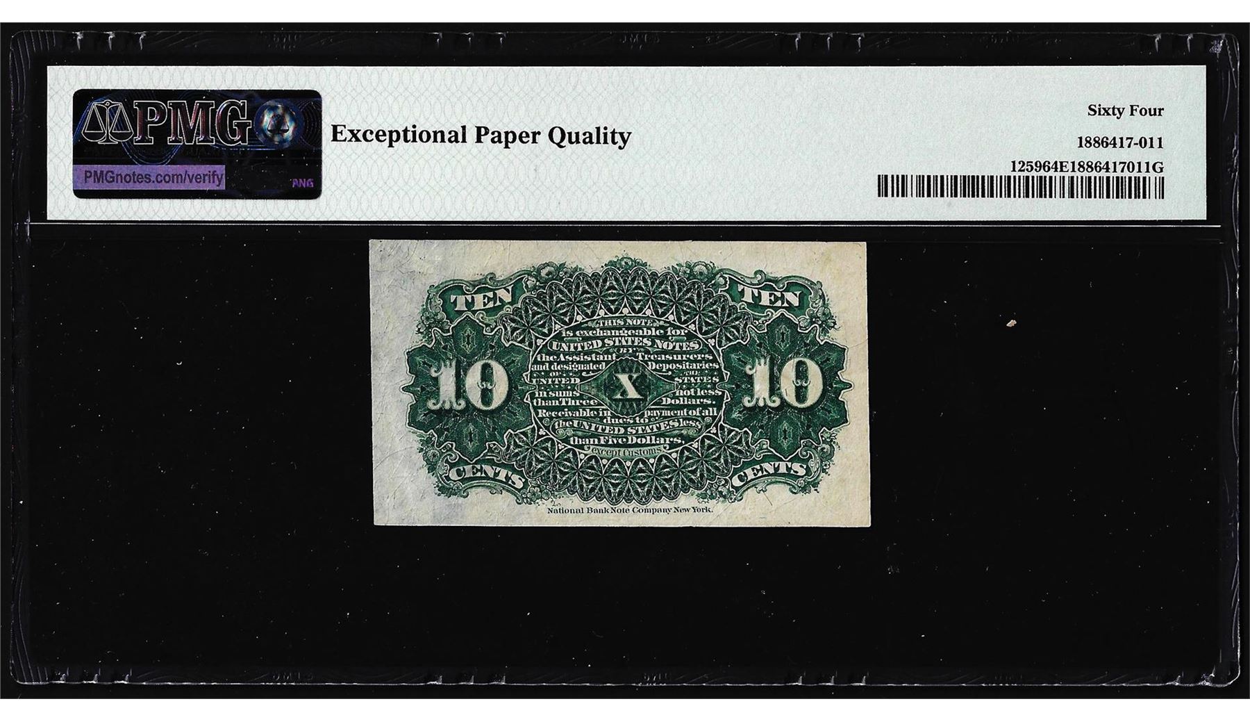 One 1863 10 Cent Fourth Issue Fractional Currency Note Fr.1259 PMG Choice Uncirculated 64EPQ. PMG Certified.