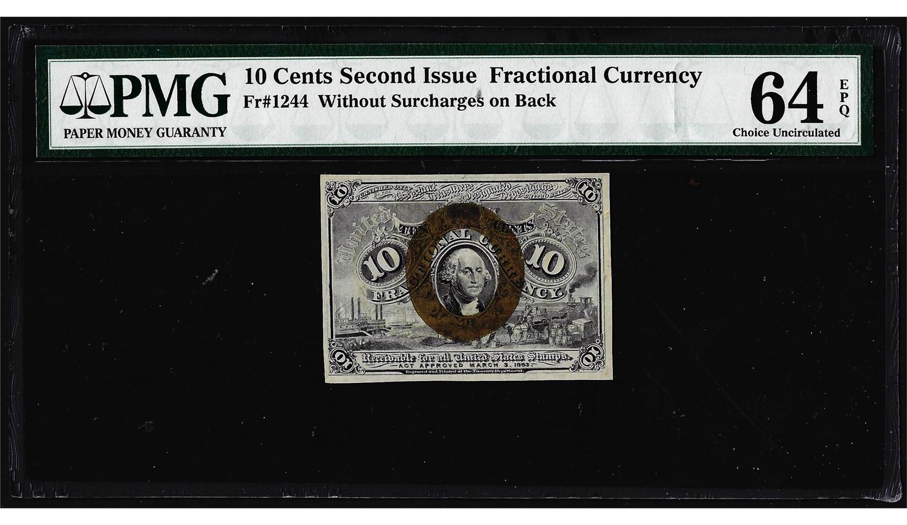 One 1863 10 Cent Second Issue Fractional Currency Note Fr.1244 PMG Ch. Uncirculated 64EPQ. PMG Certified.
