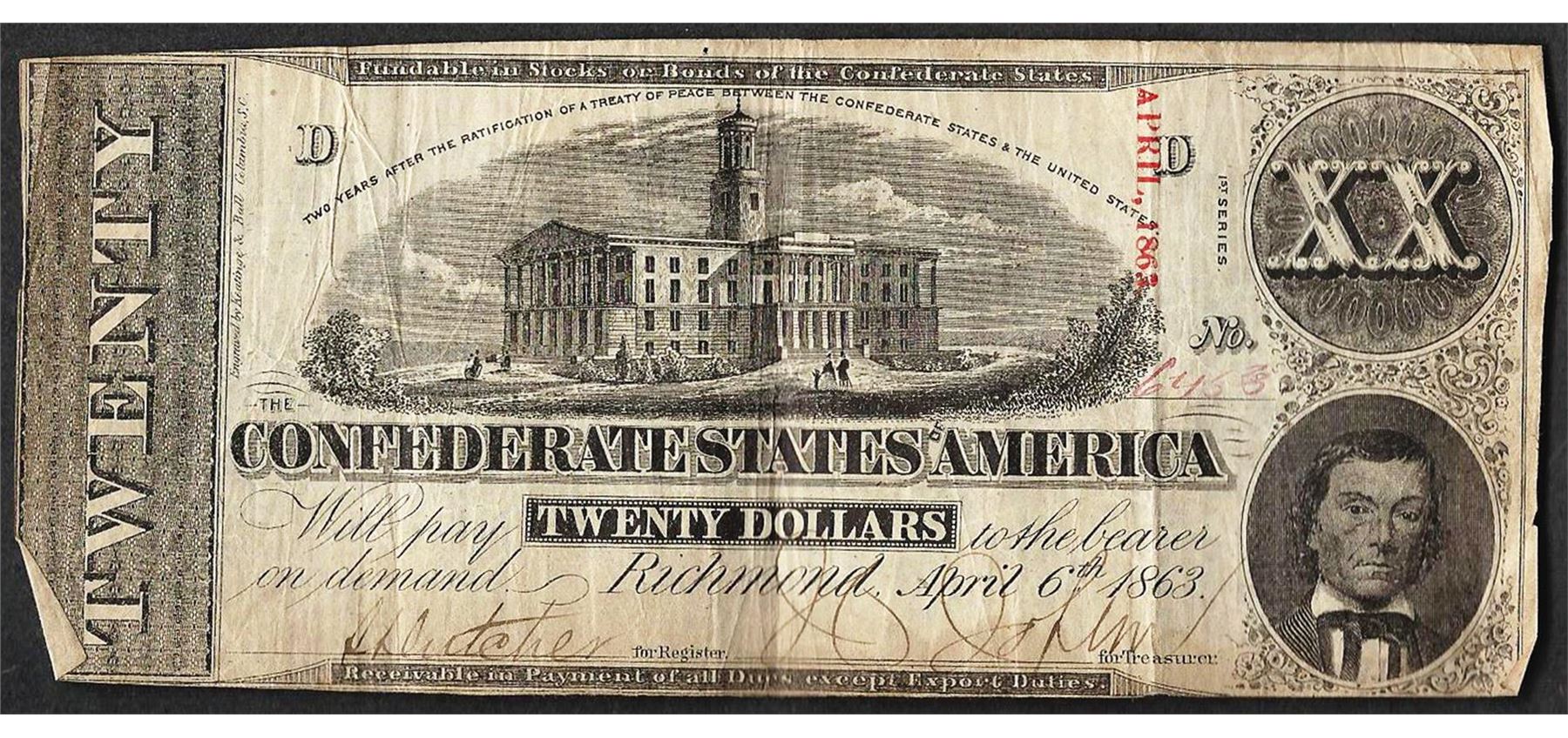 One 1863 $20 Confederate States of America Note.