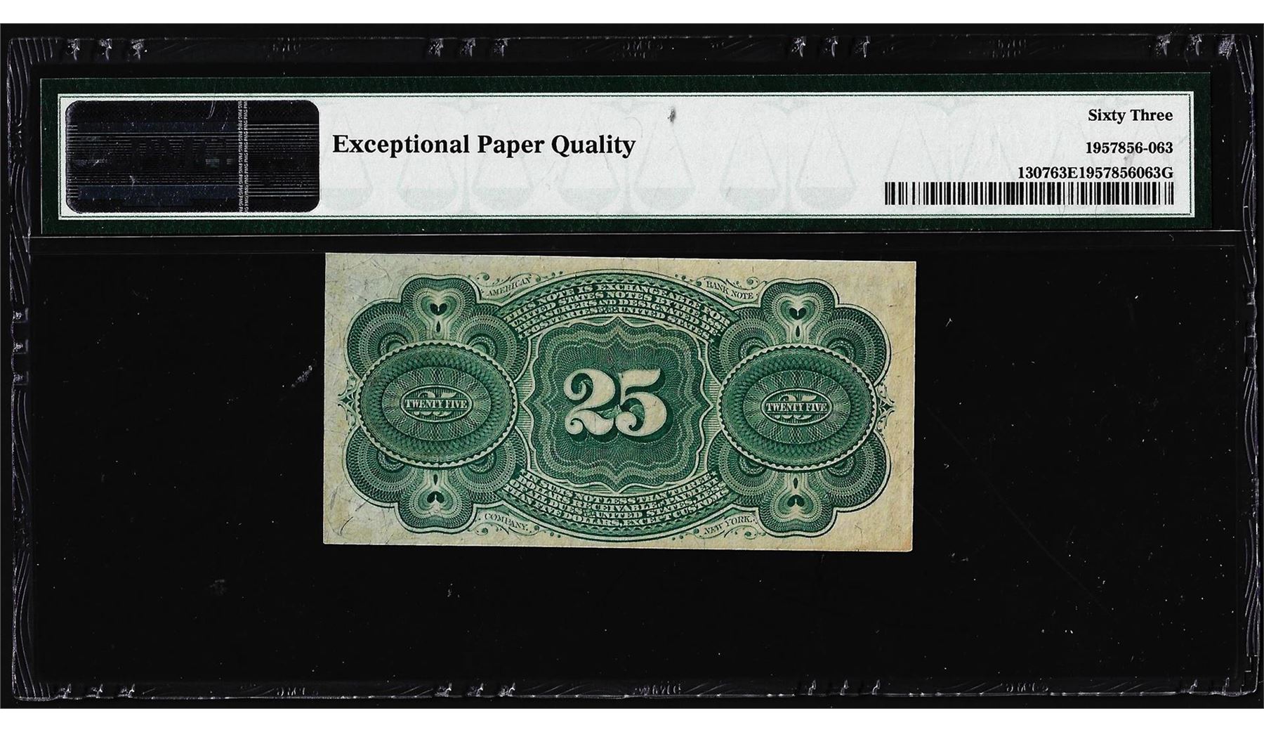 One 1863 25 Cent 4th Issue Fractional Currency Note Fr.1307 PMG Choice Uncirculated 63EPQ. PMG Certified.