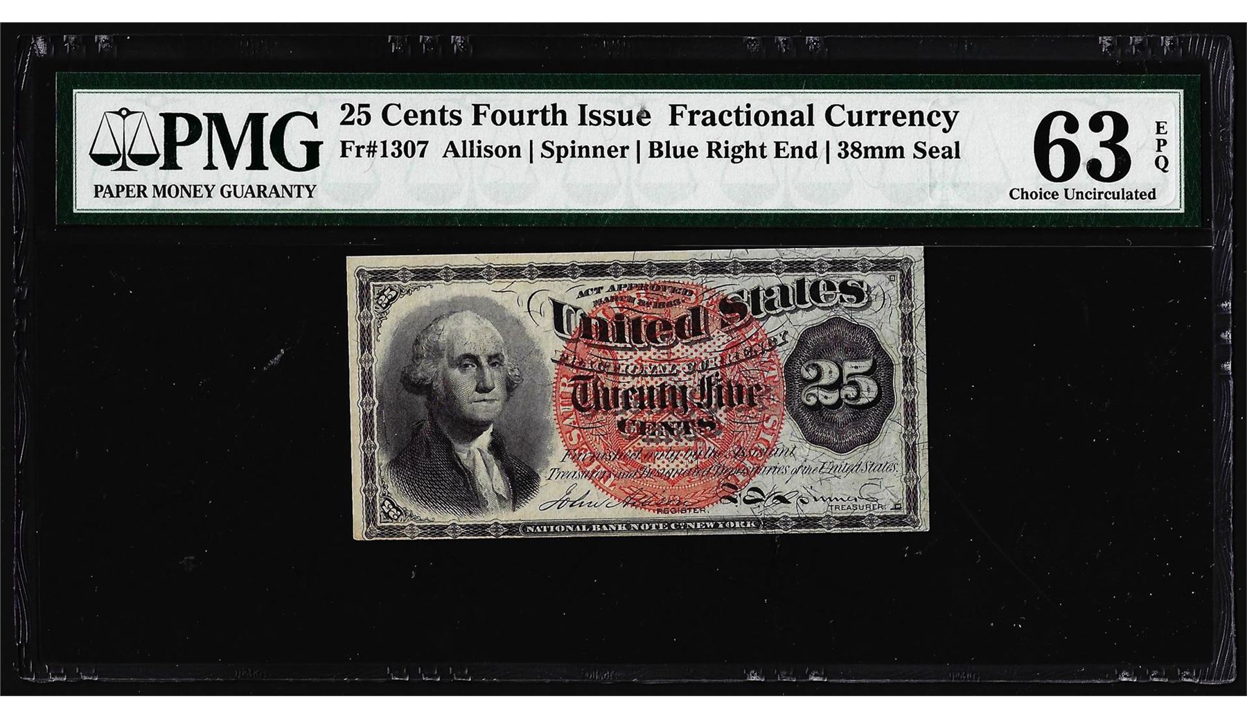 One 1863 25 Cent 4th Issue Fractional Currency Note Fr.1307 PMG Choice Uncirculated 63EPQ. PMG Certified.