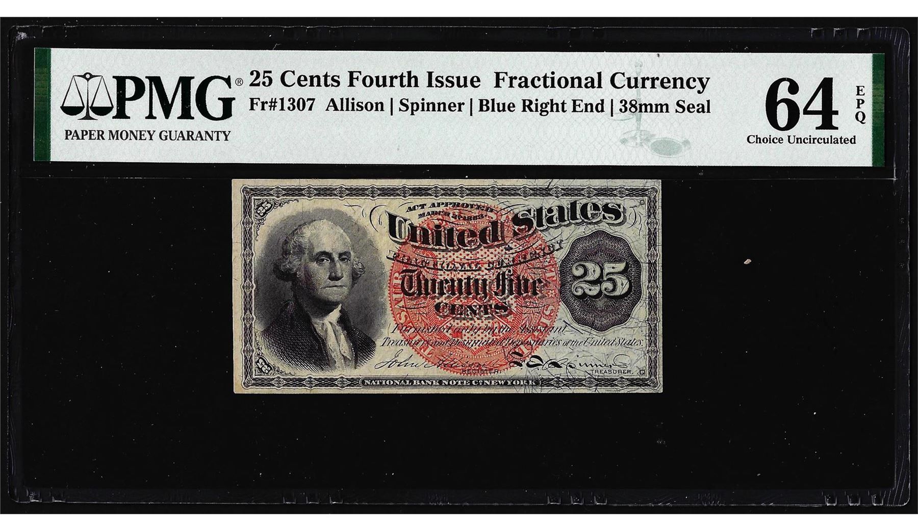 One 1863 25 Cents Fourth Issue Fractional Note Fr.1307 PMG Choice Uncirculated 64EPQ. PMG Certified.