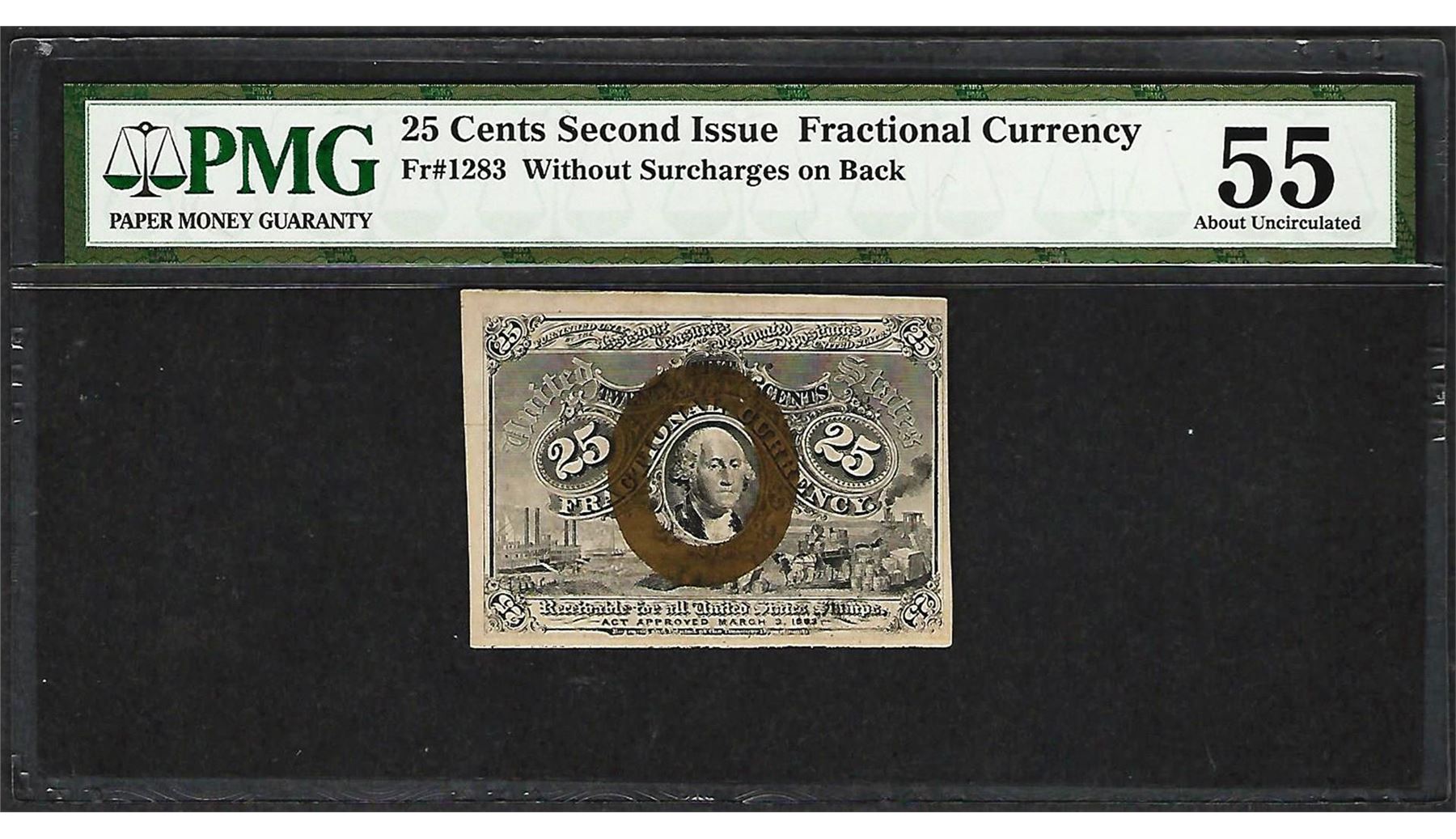 One 1863 25 Cents Second Issue Fractional Currency Note Fr.1283 PMG About Uncirculated 55. PMG Certified.