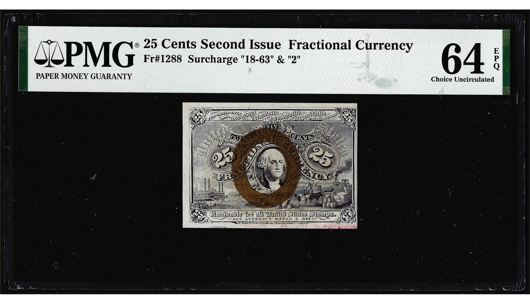 One 1863 25 Cents Second Issue Fractional Note Fr.1288 PMG Choice Uncirculated 64EPQ. PMG Certified.