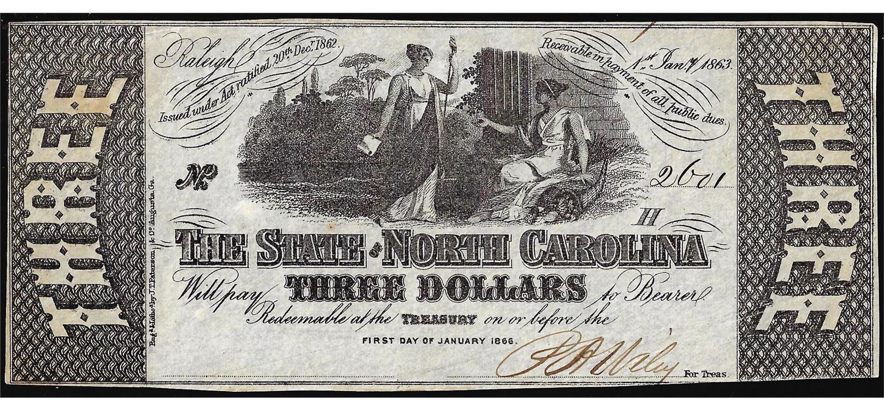 One 1863 $3 State of North Carolina Raliegh Obsolete Note.