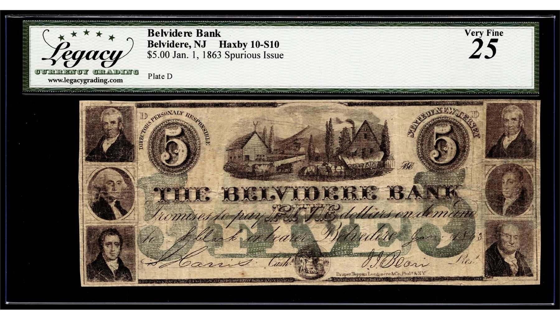 One 1863 $5 Belvidere Bank Belvidere, NJ Haxby 10-S10 Obsolete Note Legacy Very Fine 25. Legacy Graded.