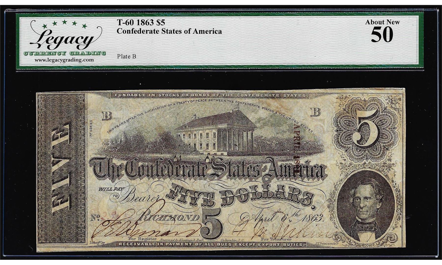 One 1863 $5 Confederate State of America Note T-60 Legacy About New 50. Legacy Graded.