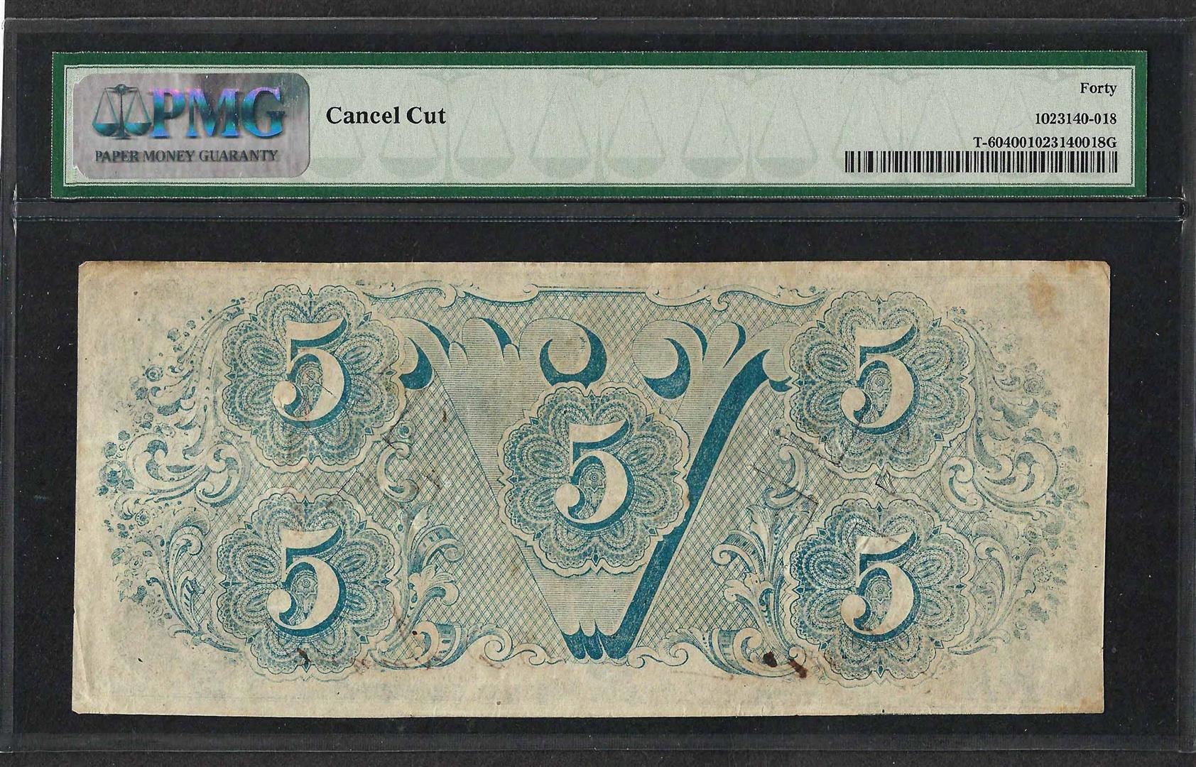 One 1863 $5 Confederate State of America Note T-60 PMG Extremely Fine 40. PMG Certified.