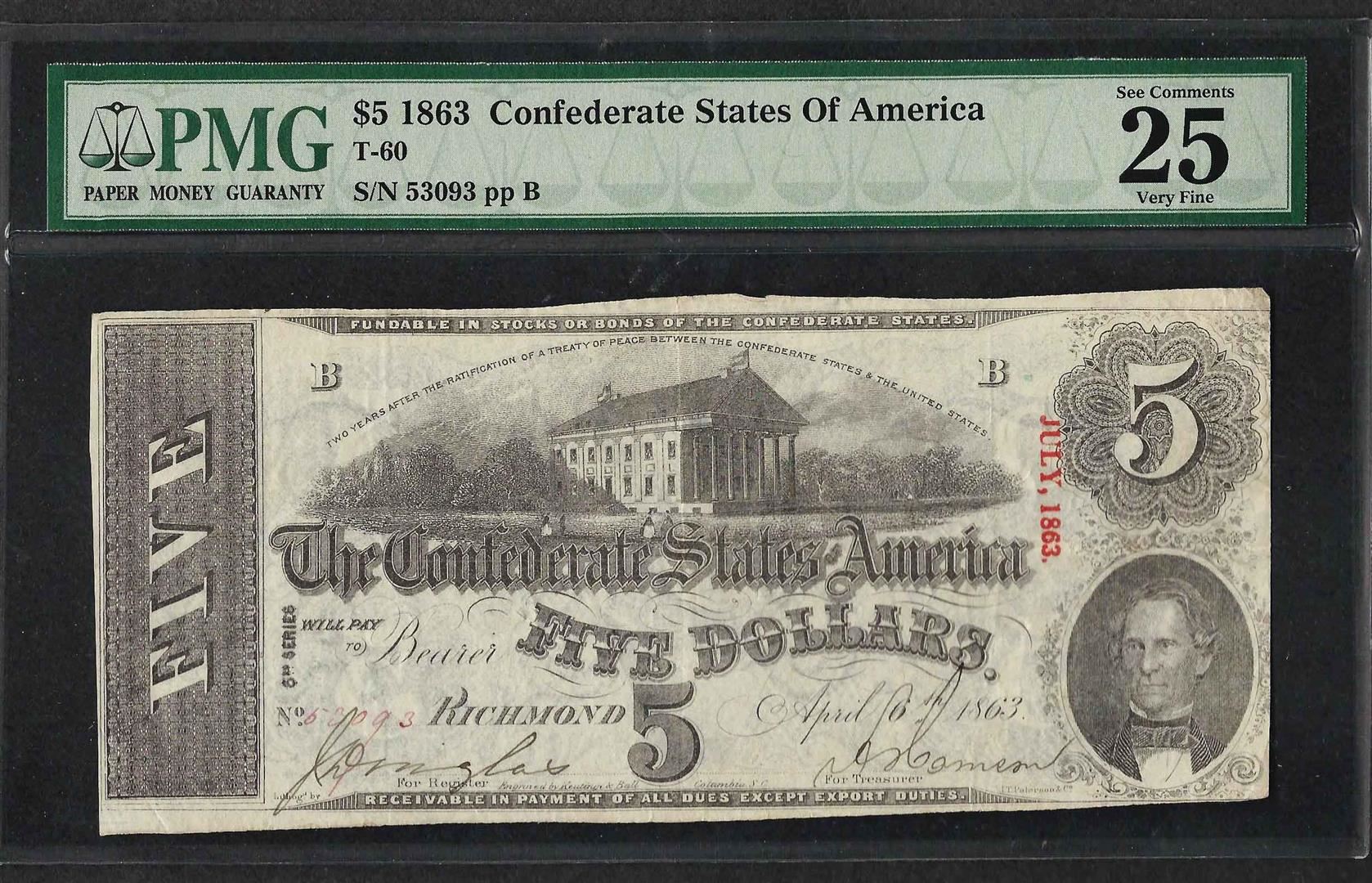 One 1863 $5 Confederate State of America Note T-60 PMG Very Fine 25. PMG Certified.