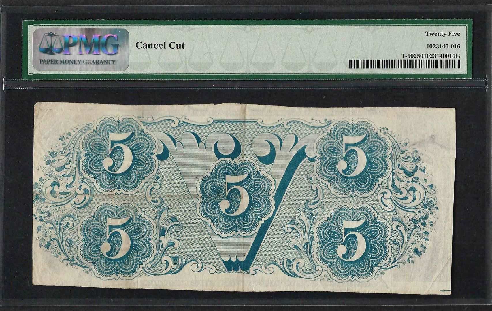 1863 $5 Confederate State of America Note T-60 PMG Very Fine 25