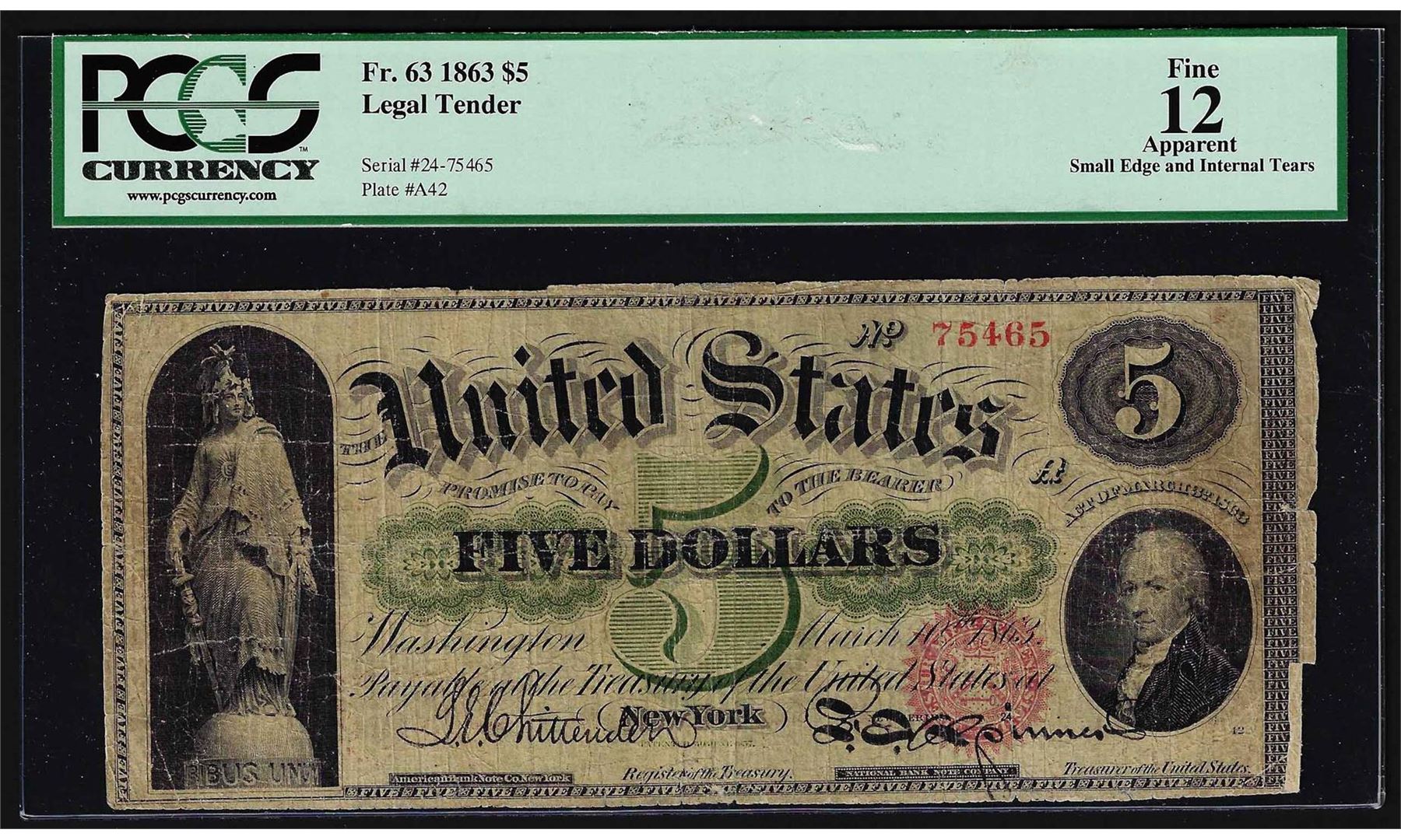 One 1863 $5 Legal Tender Note Fr.63 PCGS Fine 12 Apparent. PCGS Graded.