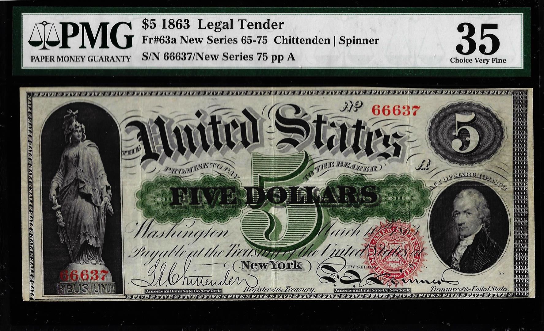 One 1863 $5 Legal Tender Note Fr.63a PMG Choice Very Fine 35. PMG Certified.