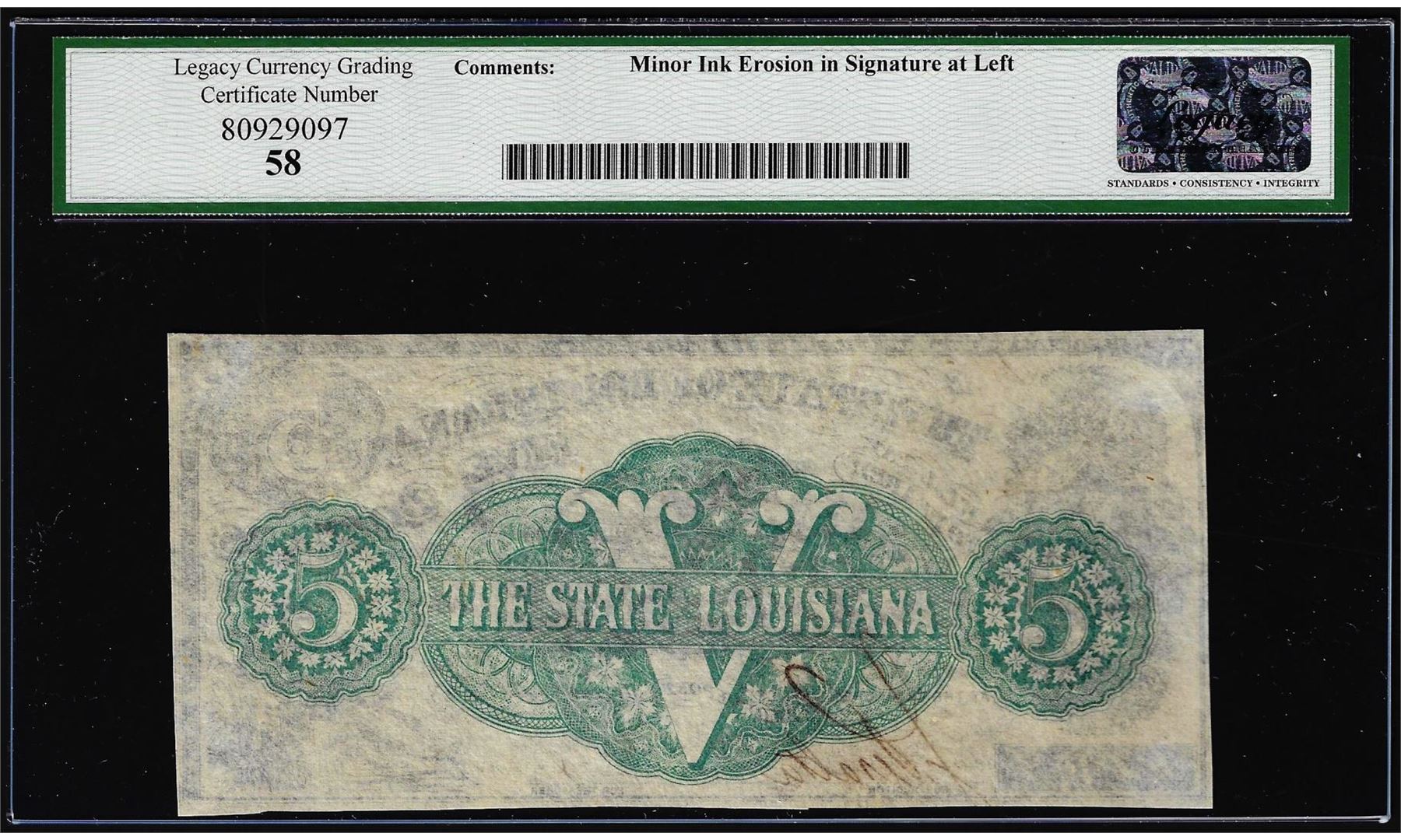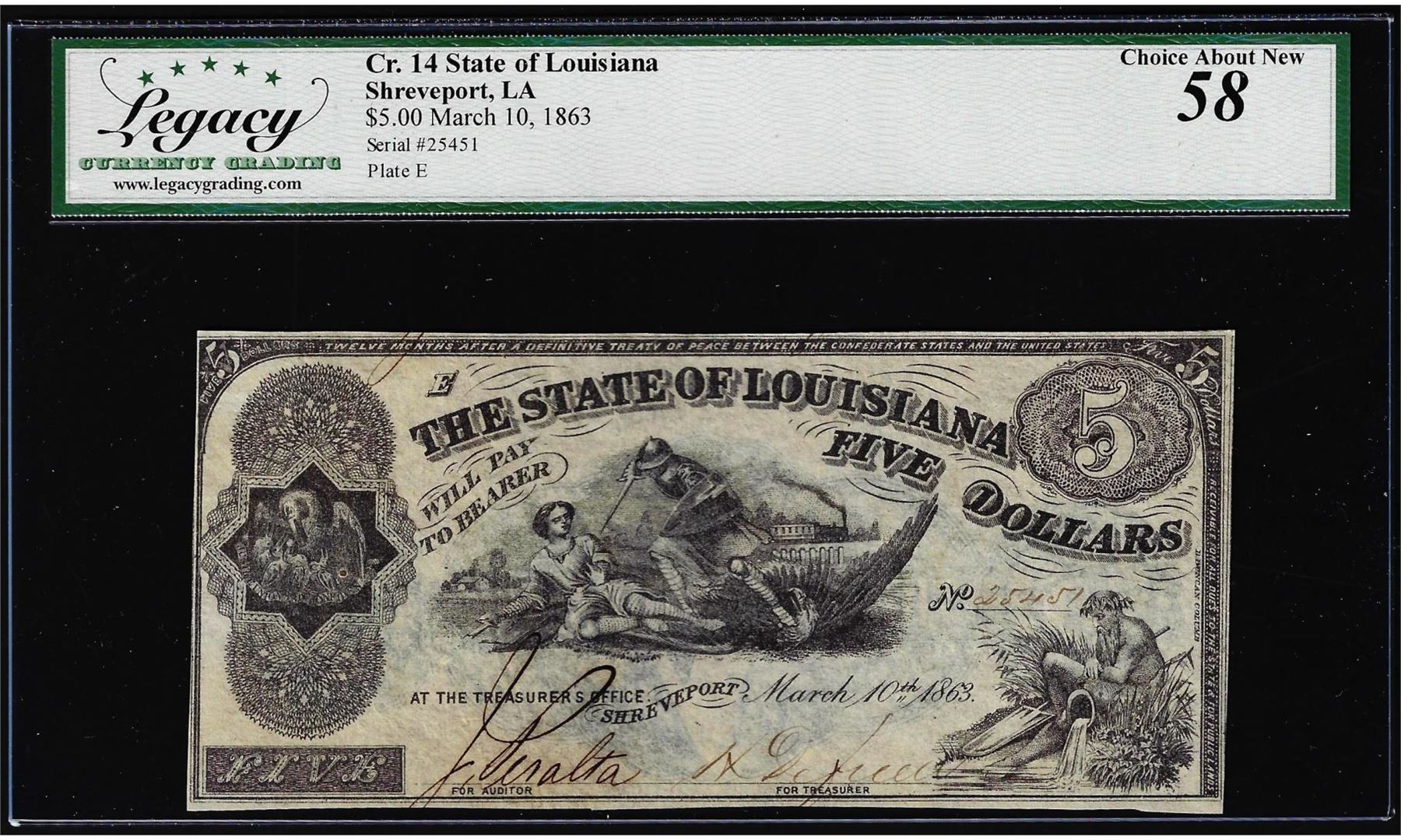 One 1863 $5 State of Louisiana Obsolete Bank Note Cr. 14 Legacy Choice About New 58. Legacy Graded.