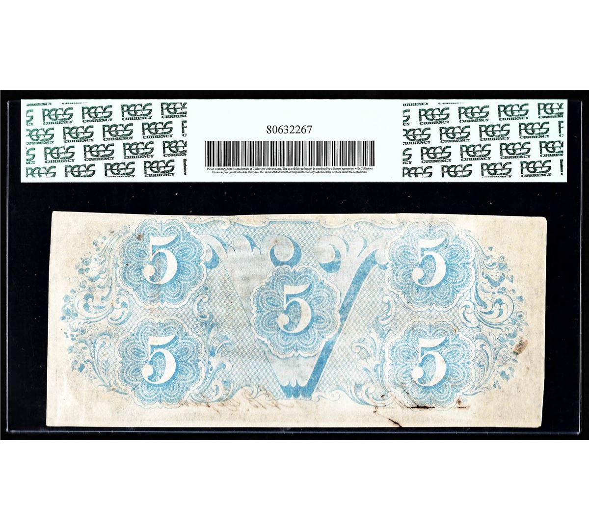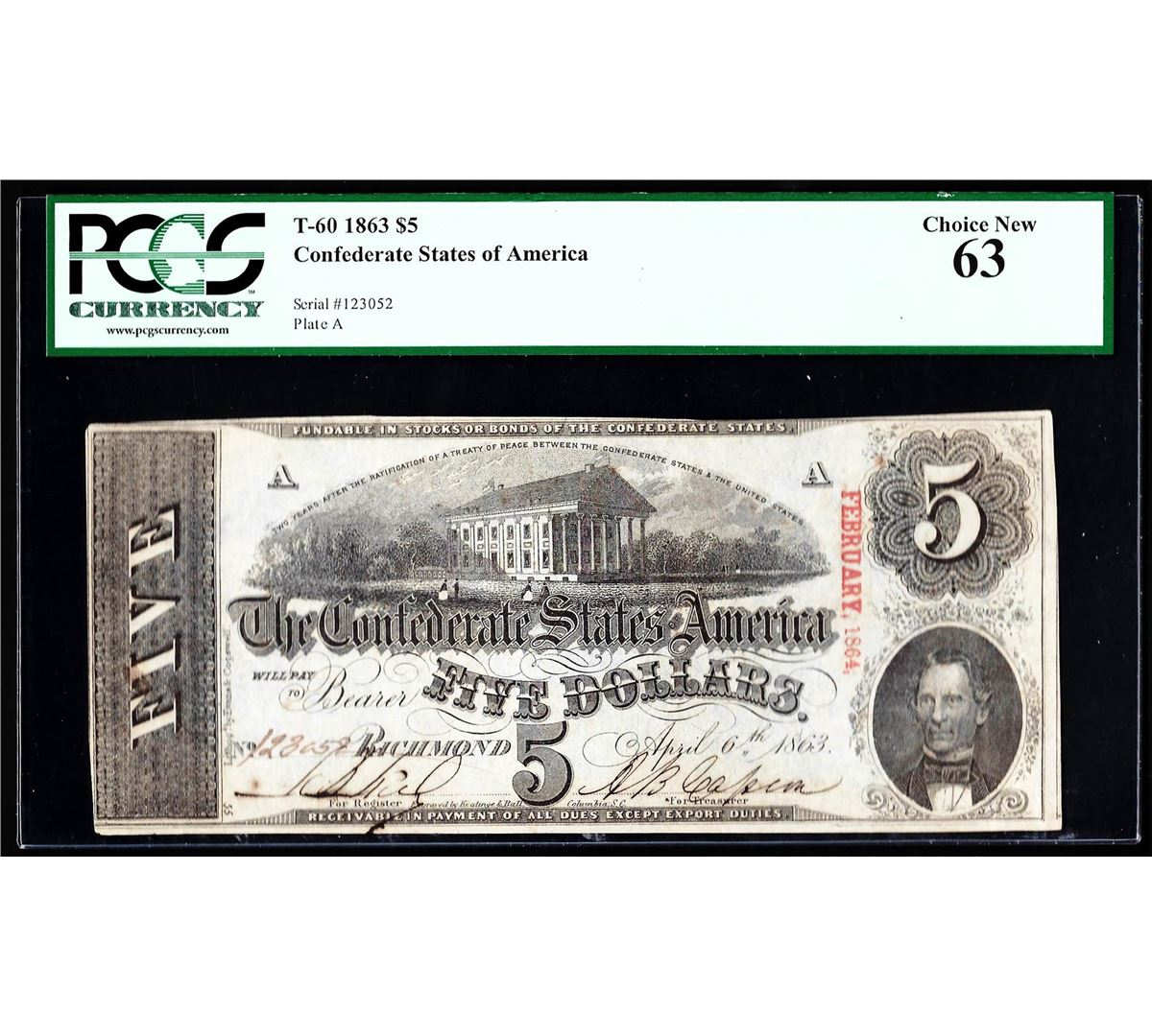 One 1863 $5 The Confederate States of America Note PCGS Choice New 63. PCGS Graded.