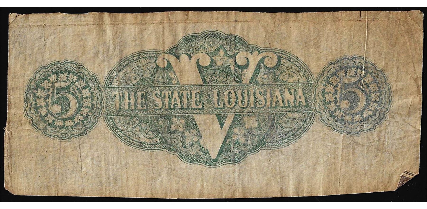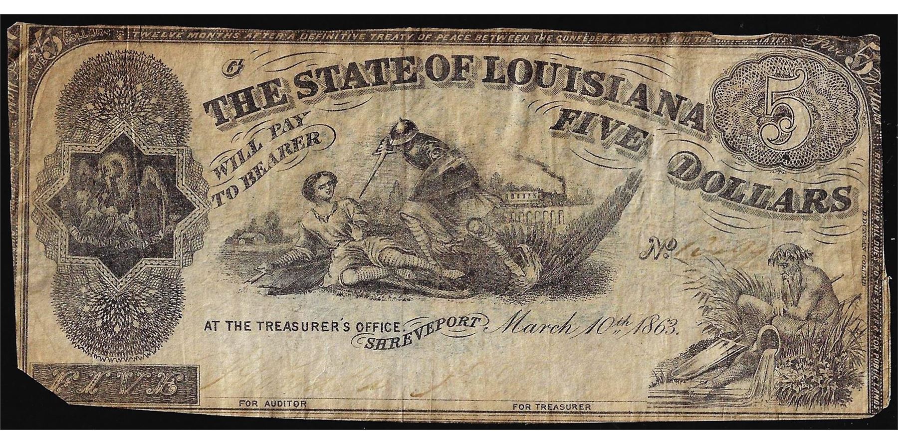One 1863 $5 The State of Louisiana Baton Rouge, LA Obsolete Banknote.