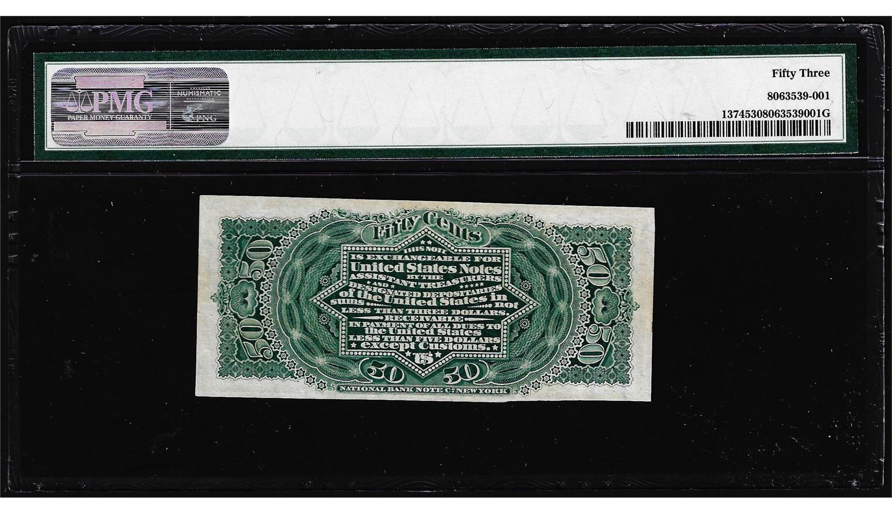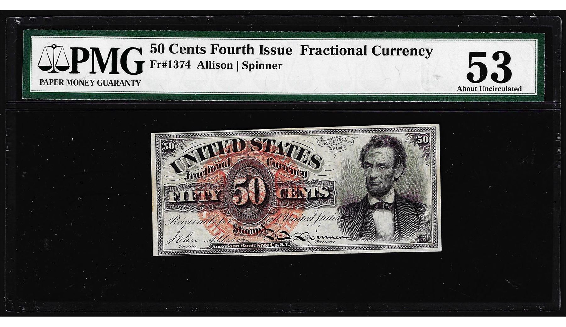 One 1863 50 Cent Fourth Issue Fractional Currency Note Fr.1374 PMG About Uncirculated 53. PMG Certified.