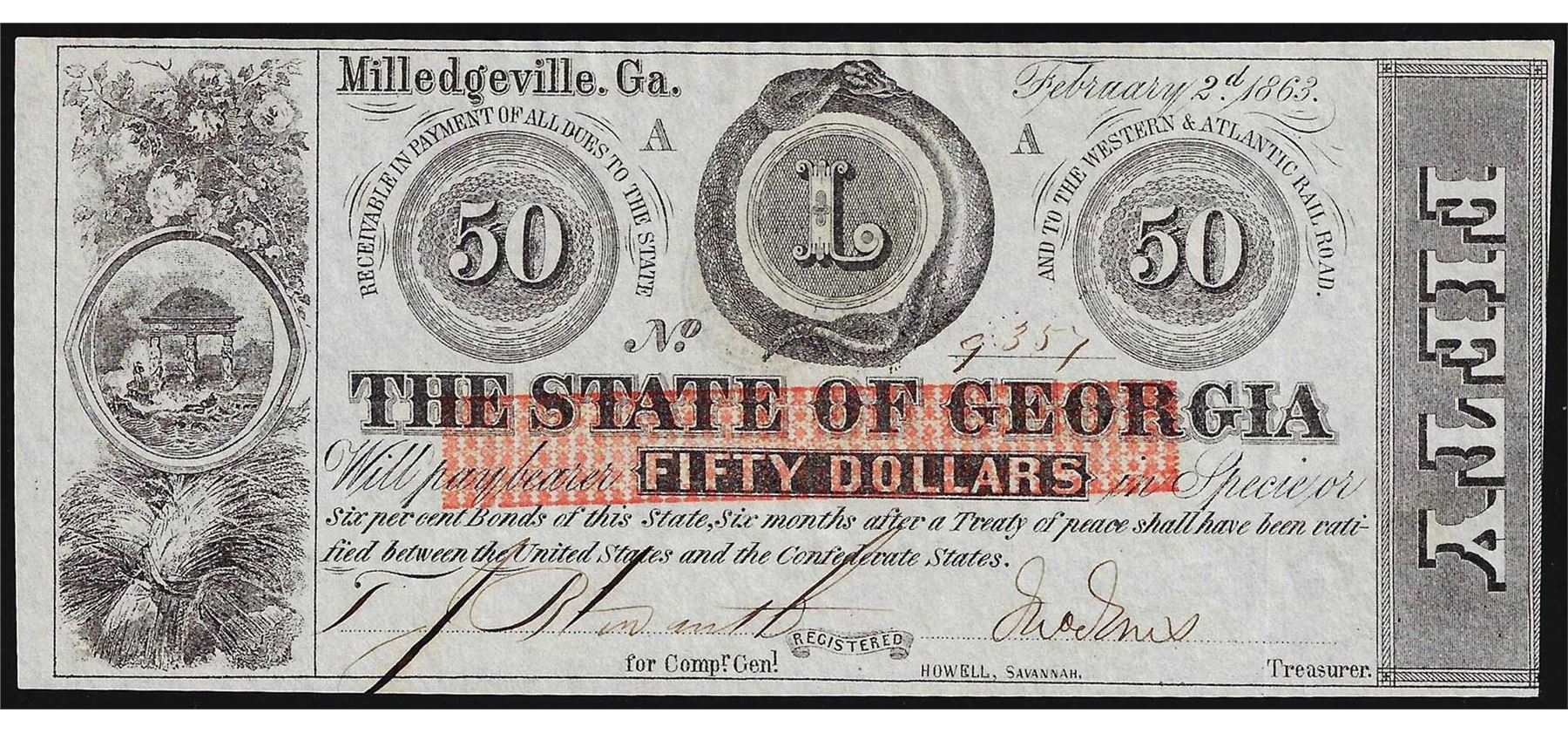 One 1863 $50 State of Georgia Milledgeville Obsolete Note.
