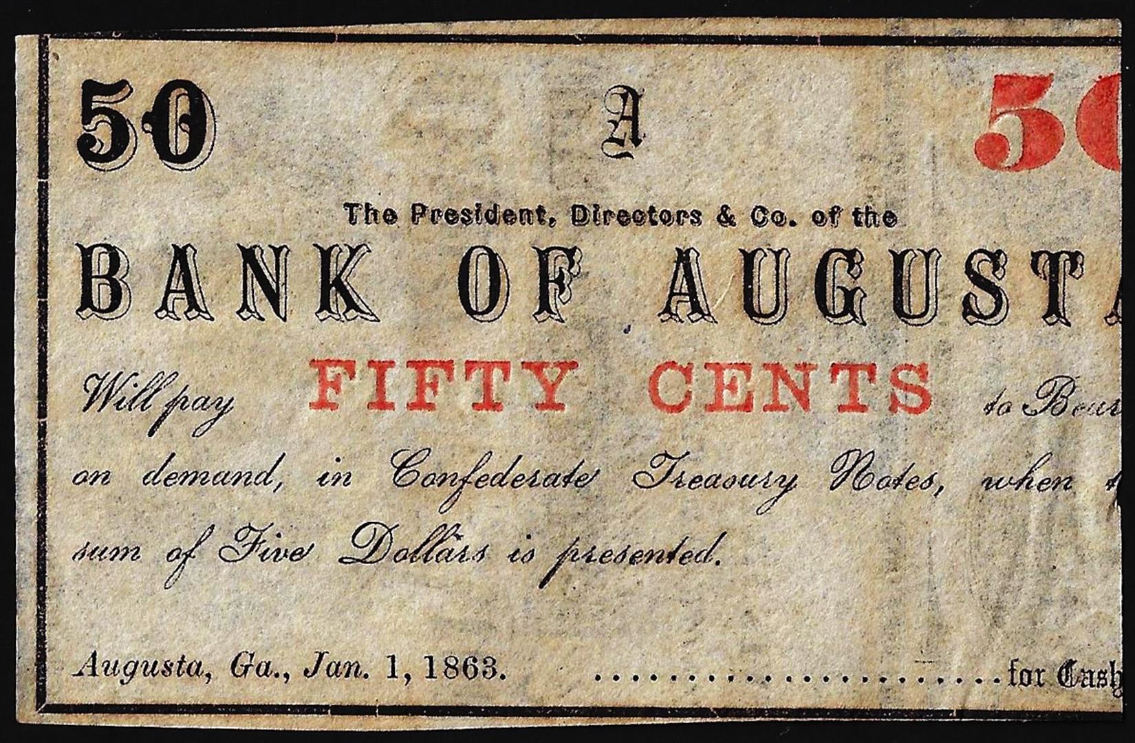 One 1863 Bank of Augusta Fifty Cents Obsolete Bank Note.