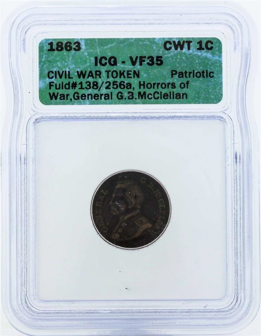 One 1863 Civil War 1 Cent Token Patriotic ICG VF35. ICG Certified.