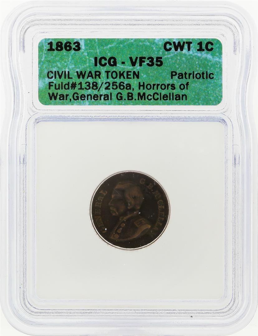 One 1863 Civil War Token General Horros of War ICG Graded VF35. ICG Certified.