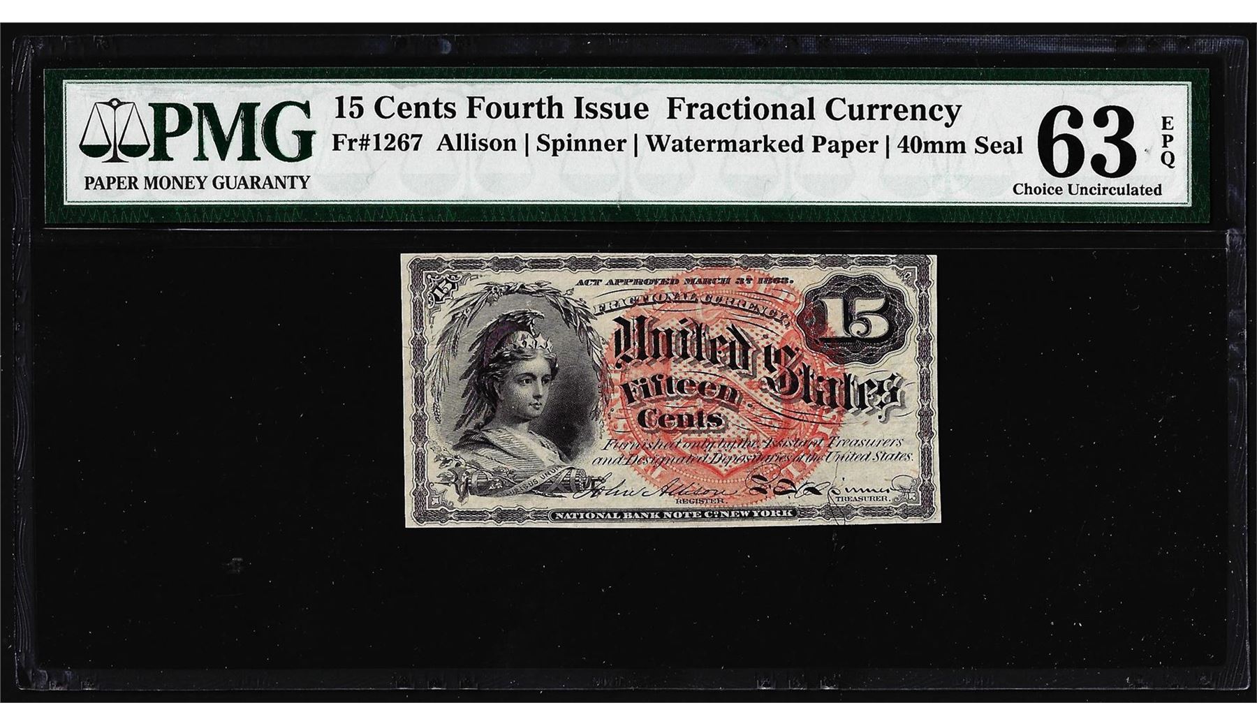 One 1863 Fifteen Cents Fourth Issue Fractional Currency Note PMG Choice Unc. 63EPQ. PMG Certified.