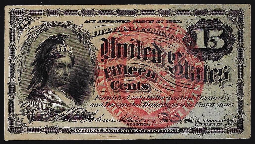 One 1863 Fifteen Cents Fourth Issue Fractional Note.