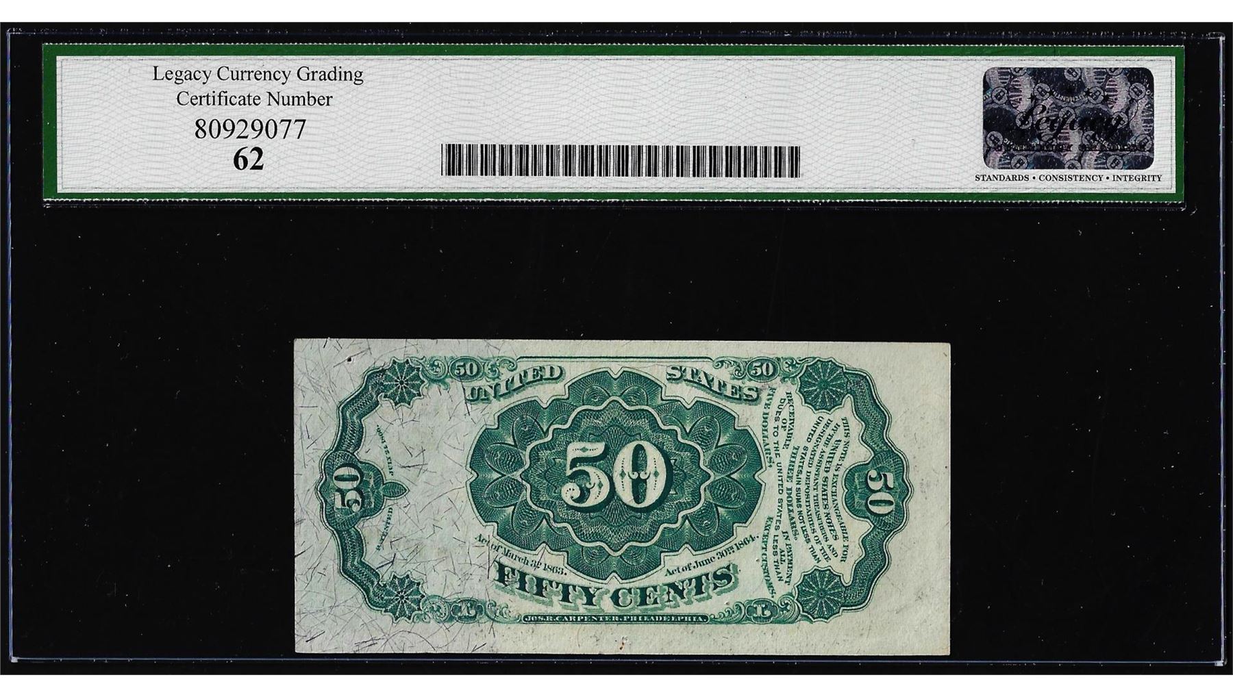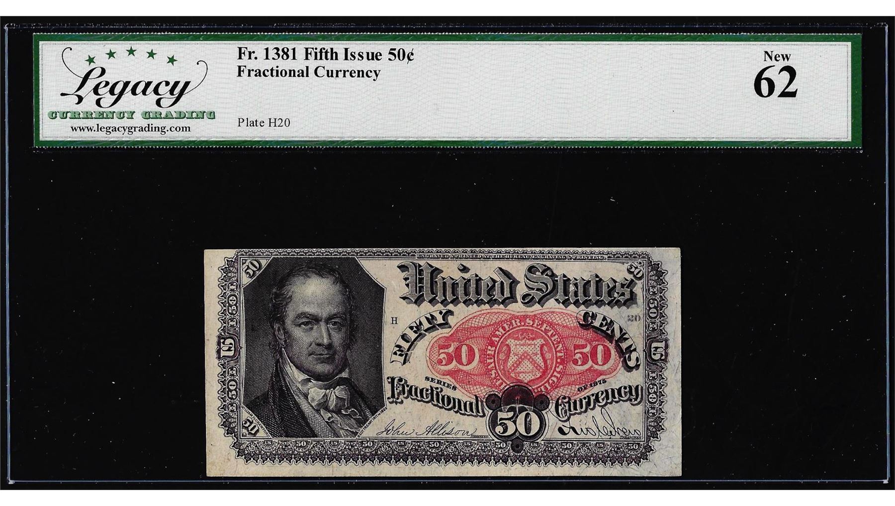One 1863 Fifth Issue 50 Cents Fractional Currency Note Fr.1381 Legacy New 62. Legacy Graded.