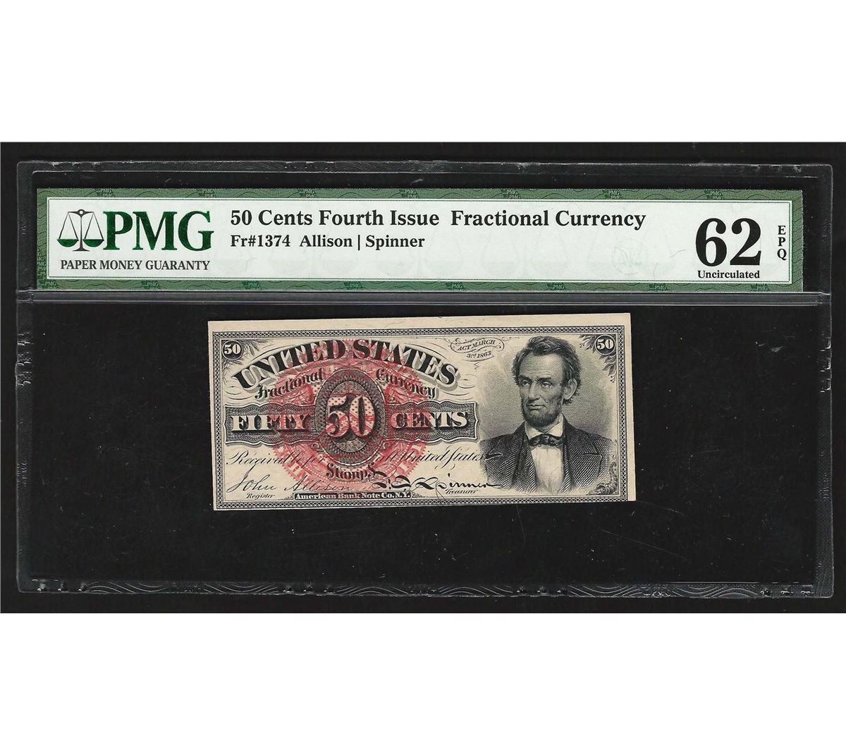 One 1863 Fifty Cents Fourth Issue Fractional Currency Note PMG 62EPQ. PMG Certified.
