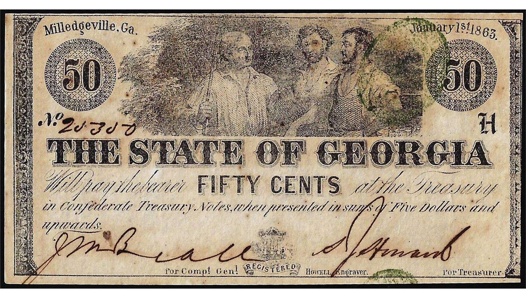 One 1863 Fifty Cents State of Georgia Milledgeville, GA Obsolete Note.