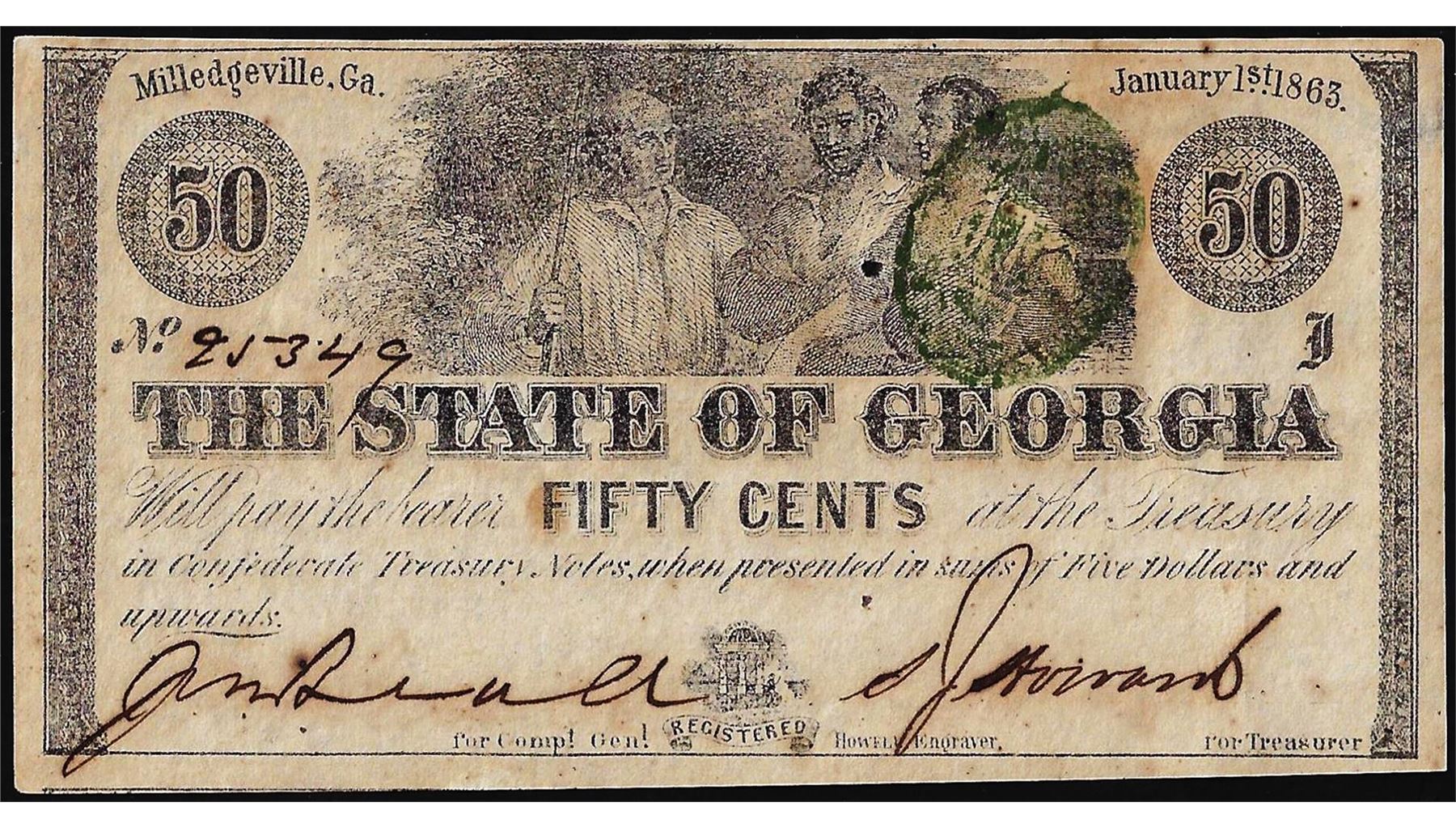 One 1863 Fifty Cents State of Georgia Milledgeville, GA Obsolete Note.