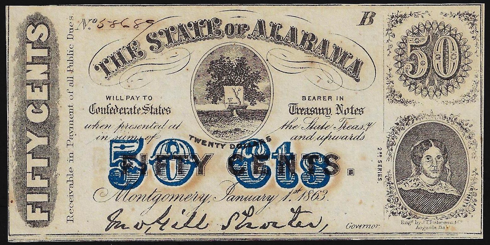 One 1863 Fifty Cents The State of Alabama Obsolete Bank Note.