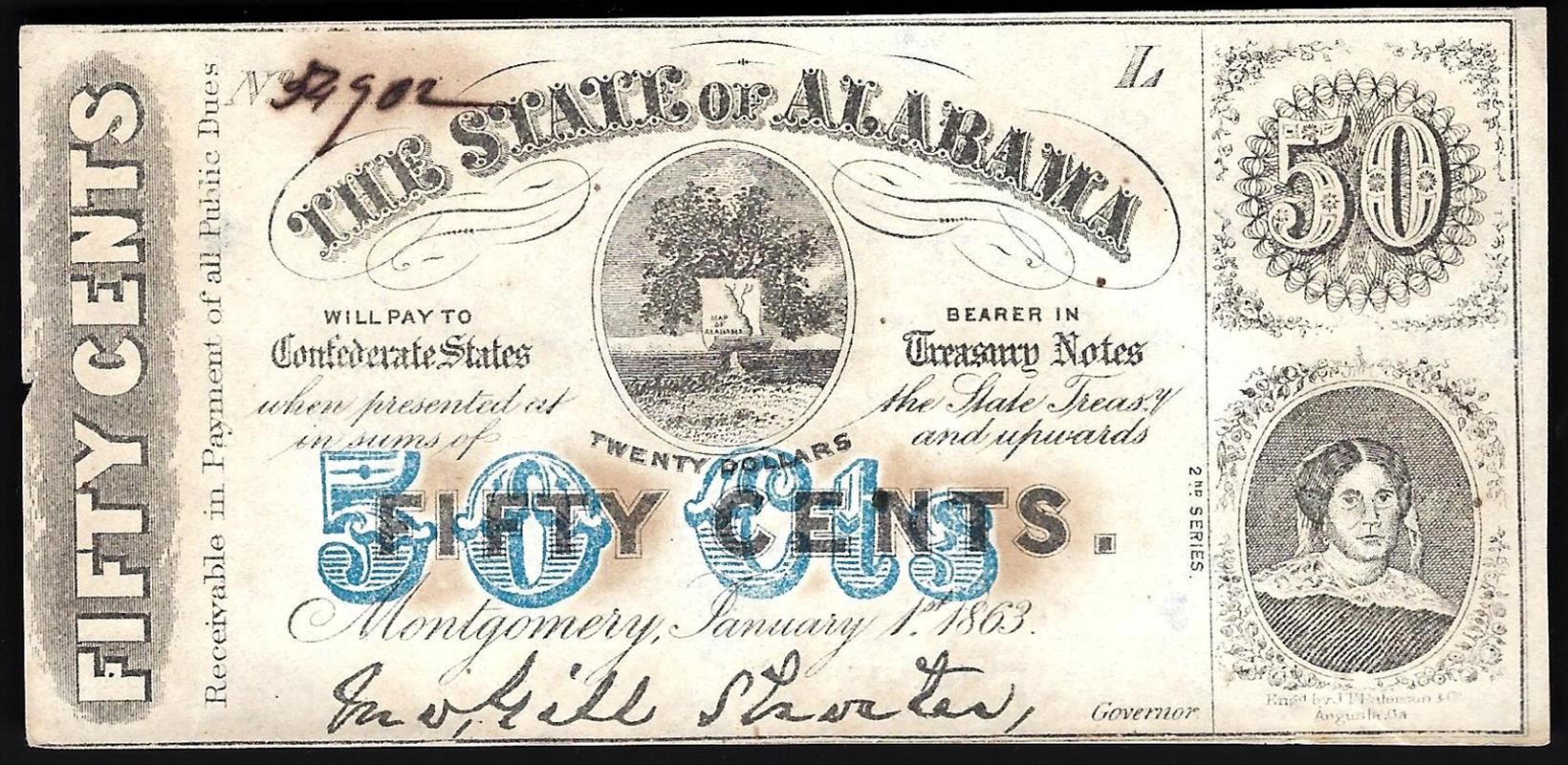 One 1863 Fifty Cents The State of Alabama Obsolete Note.