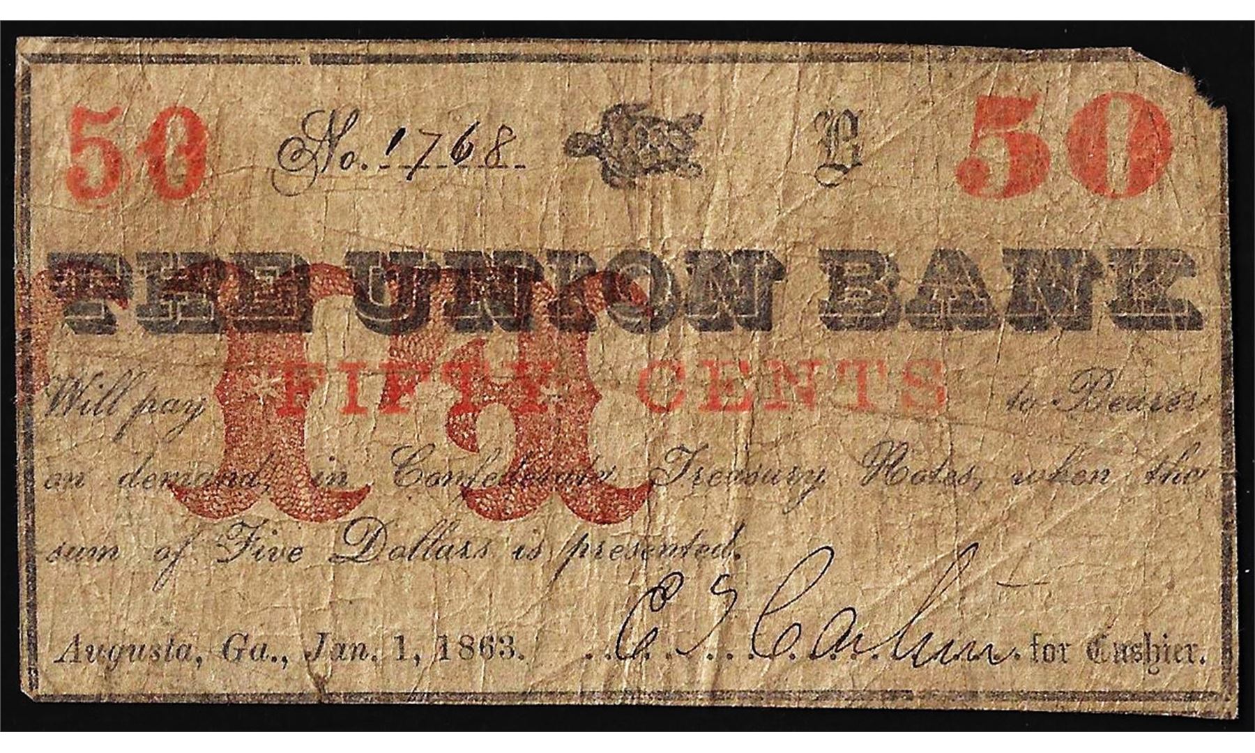 One 1863 Fifty Cents The Union Bank Augusta, GA Obsolete Banknote.