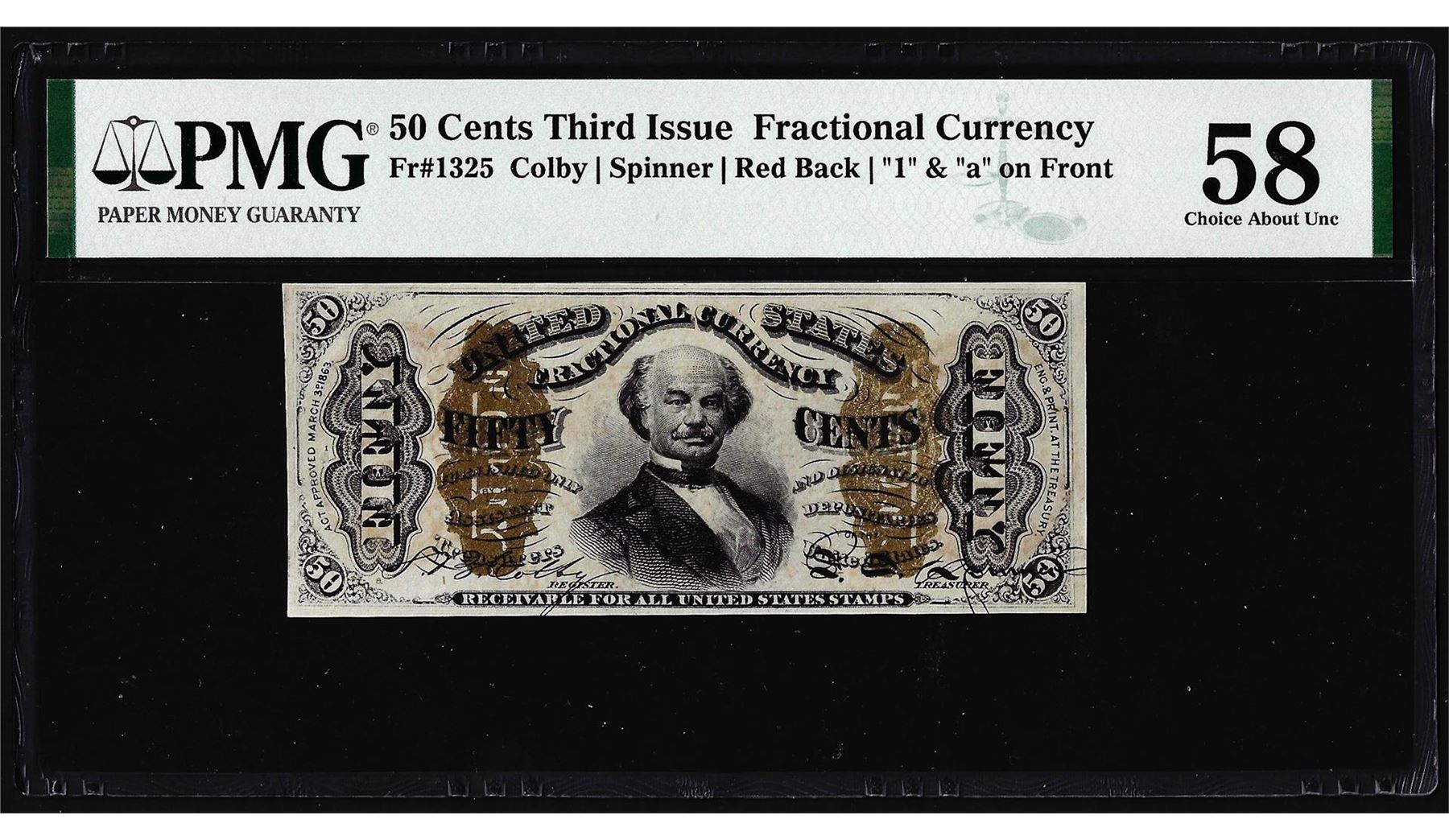 One 1863 Fifty Cents Third Issue Fractional Note Fr.1325 PMG Choice About Uncirculated 58. PMG Certified.