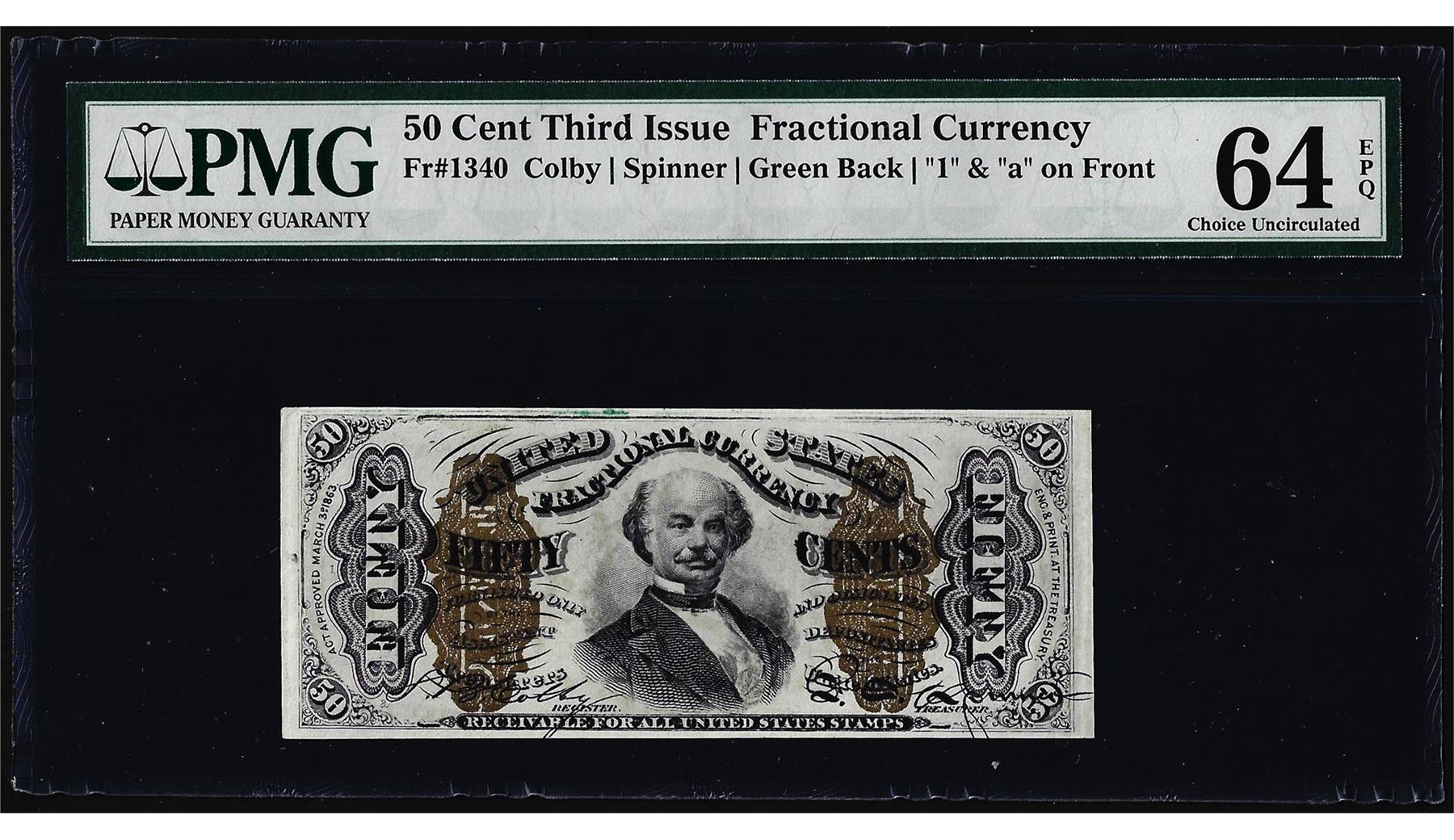 One 1863 Fifty Cents Third Issue Fractional Note Fr.1340 PMG Choice Uncirculated 64EPQ.