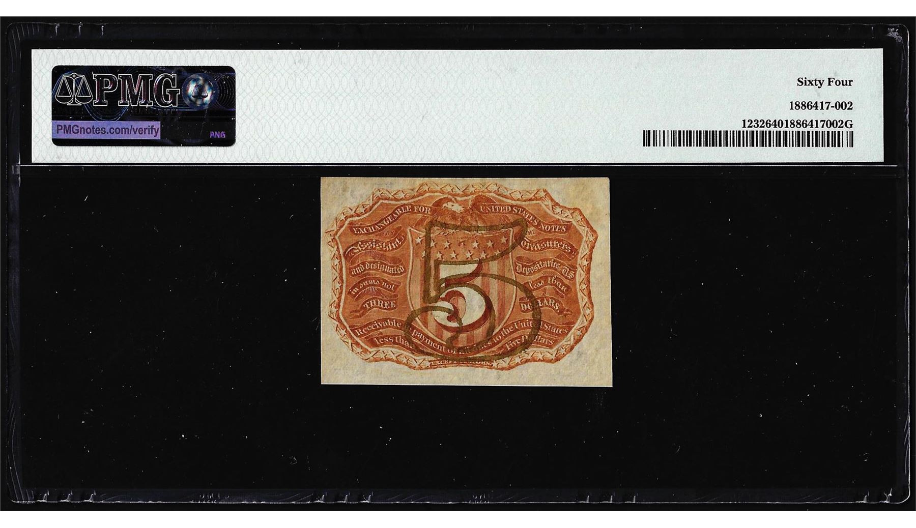 One 1863 Five Cents Second Issue Fractional Note Fr.1232 PMG Choice Uncirculated 64. PMG Certified.