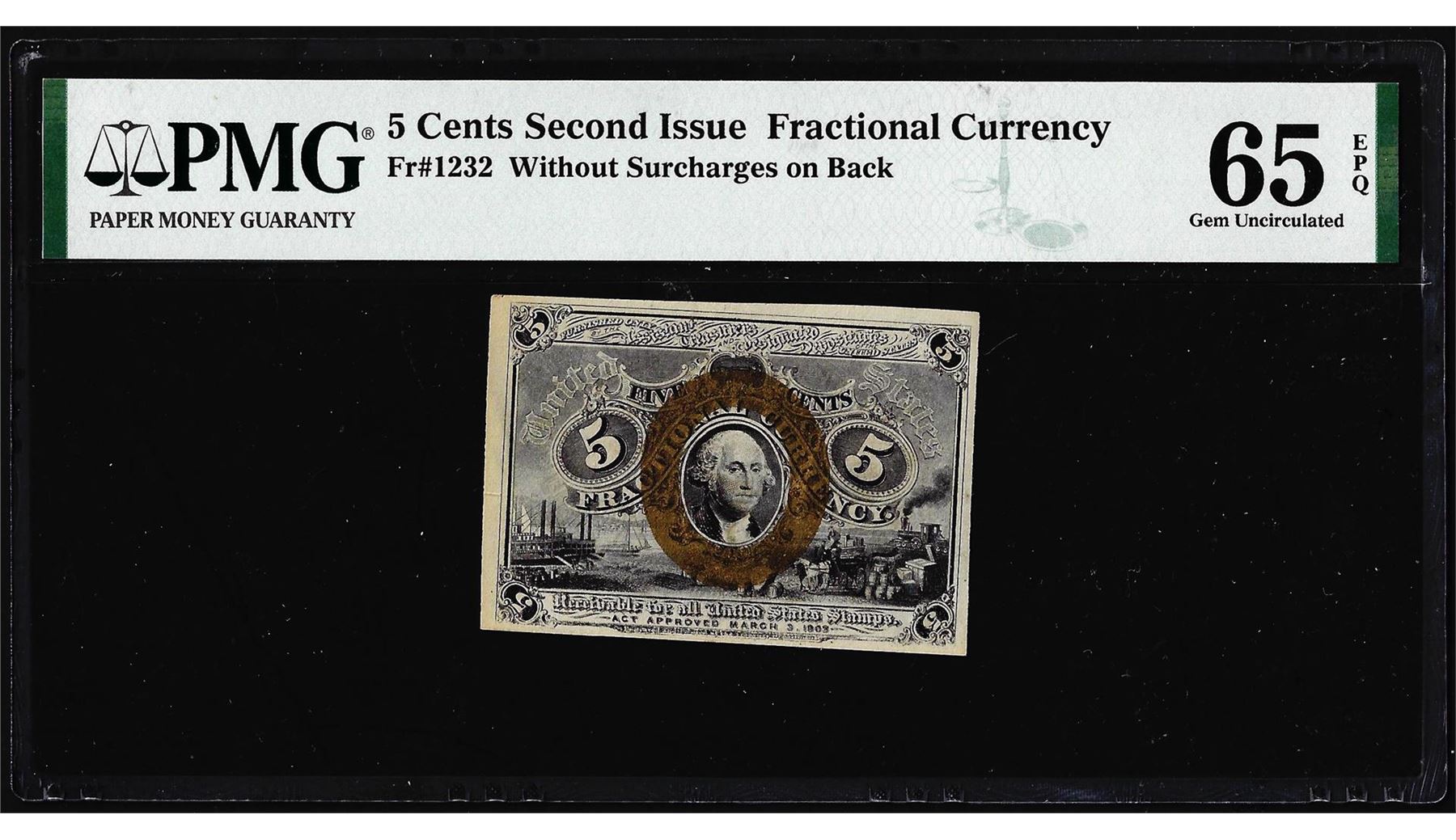 One 1863 Five Cents Second Issue Fractional Note Fr.1232 PMG Gem Uncirculated 65EPQ. PMG Certified.