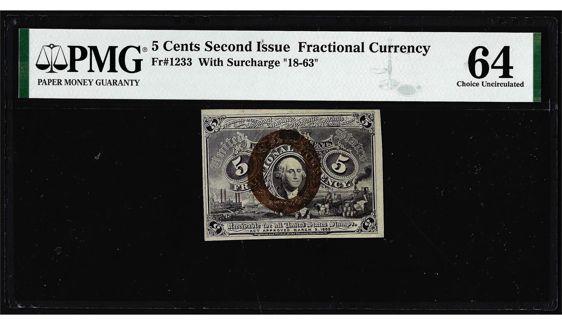 One 1863 Five Cents Second Issue Fractional Note Fr.1233 PMG Choice Uncirculated 64. PMG Certified.