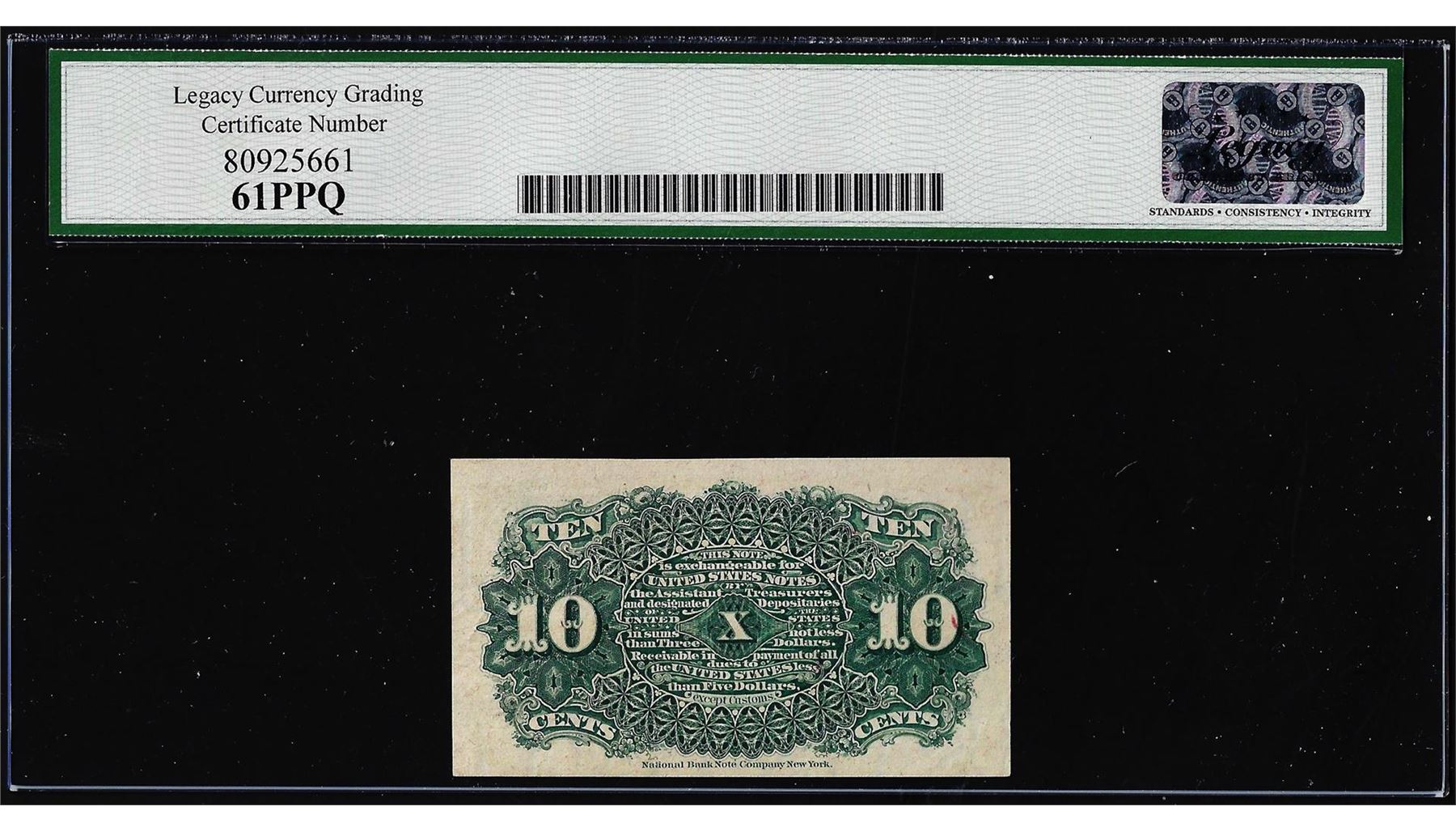 One 1863 Fourth Issue 10 Cent Fractional Currency Note Fr.1257 Legacy New 61PPQ. Legacy Graded.