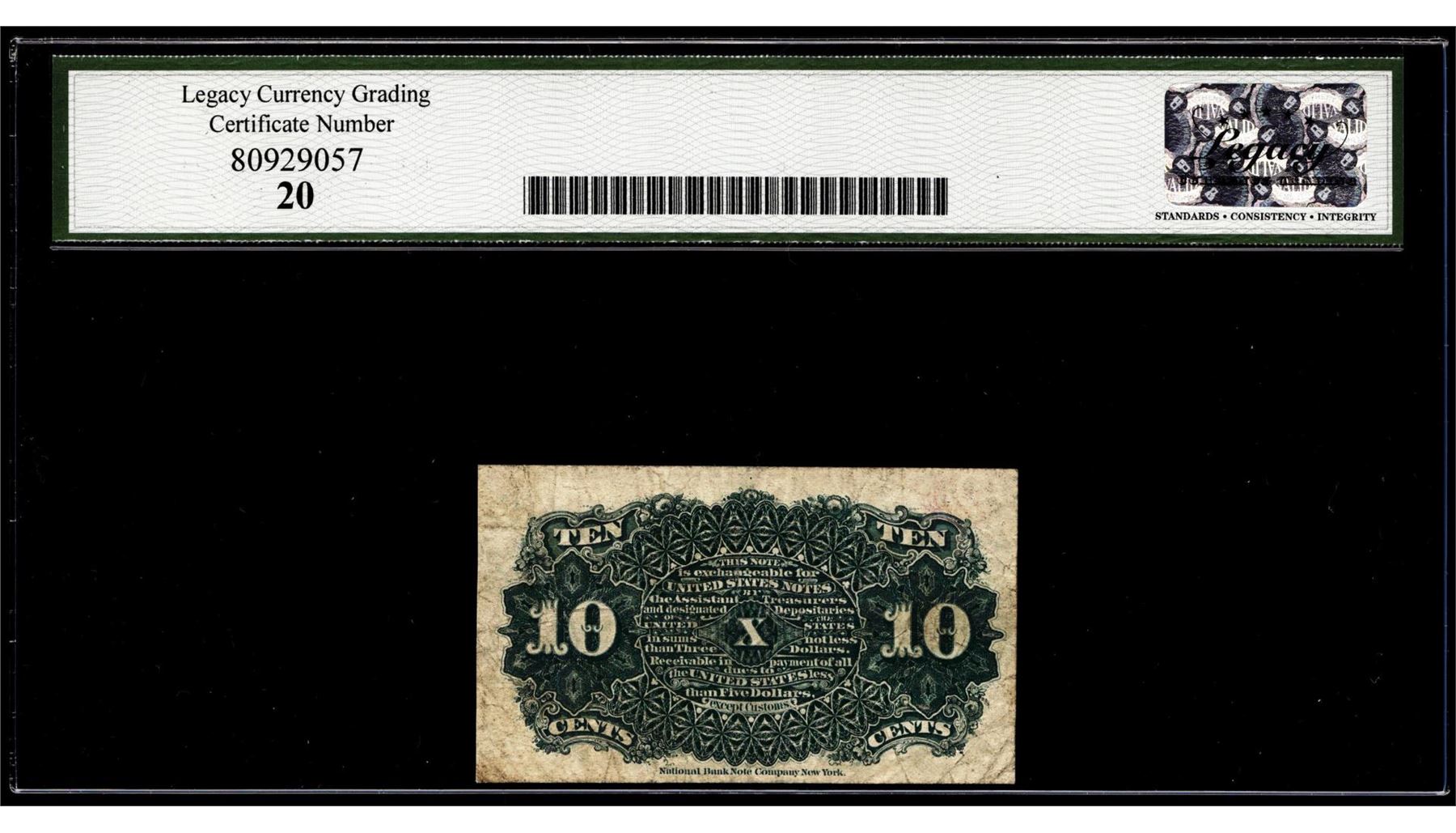 One 1863 Fourth Issue 10 Cents Fractional Currency Note Fr.1258 Legacy Very Fine 20. Legacy Graded.