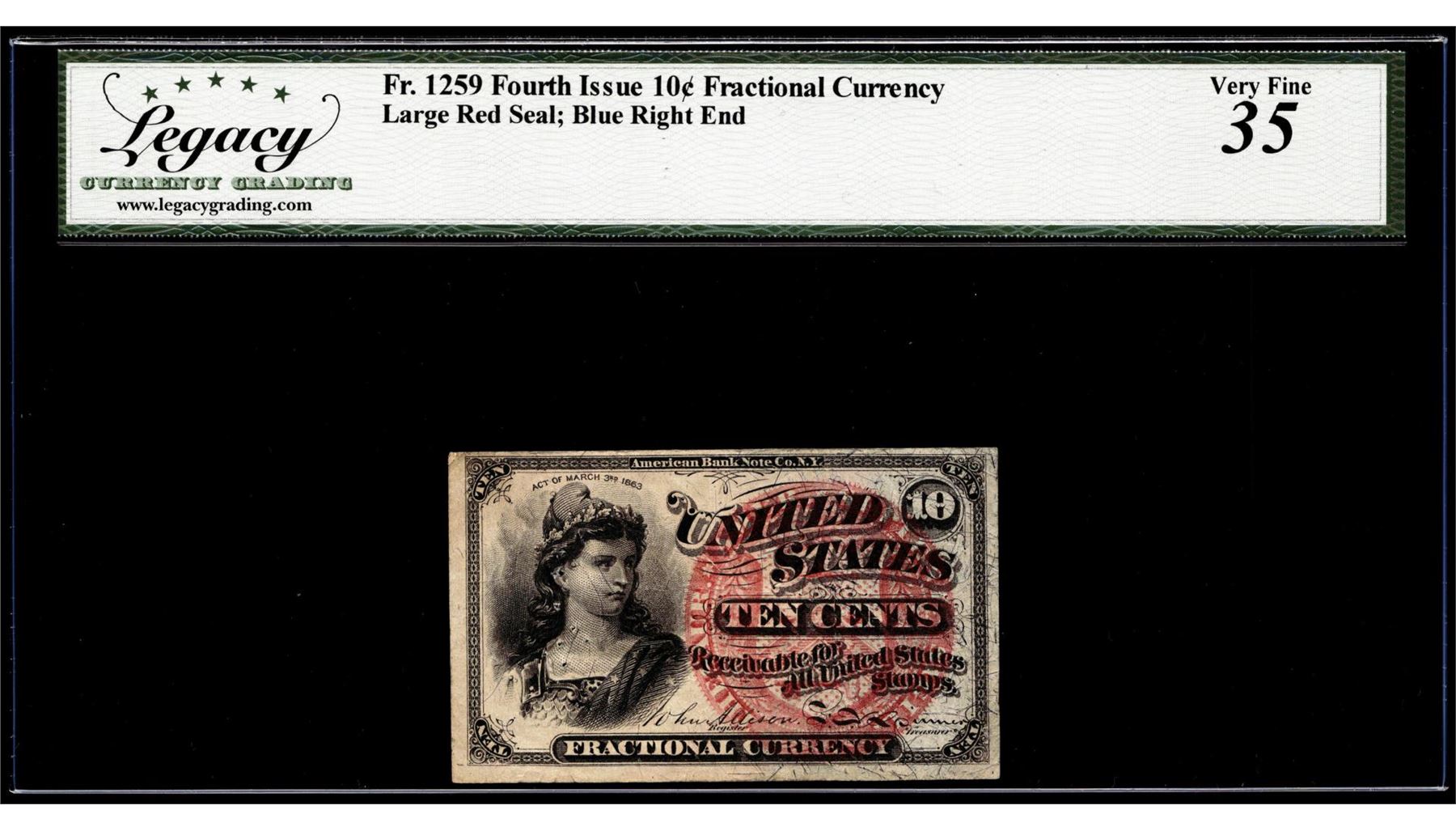 One 1863 Fourth Issue 10 Cents Fractional Currency Note Fr.1259 Legacy Very Fine 35. Legacy Graded.