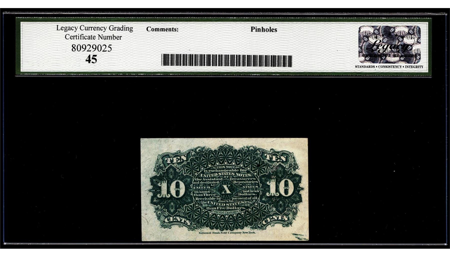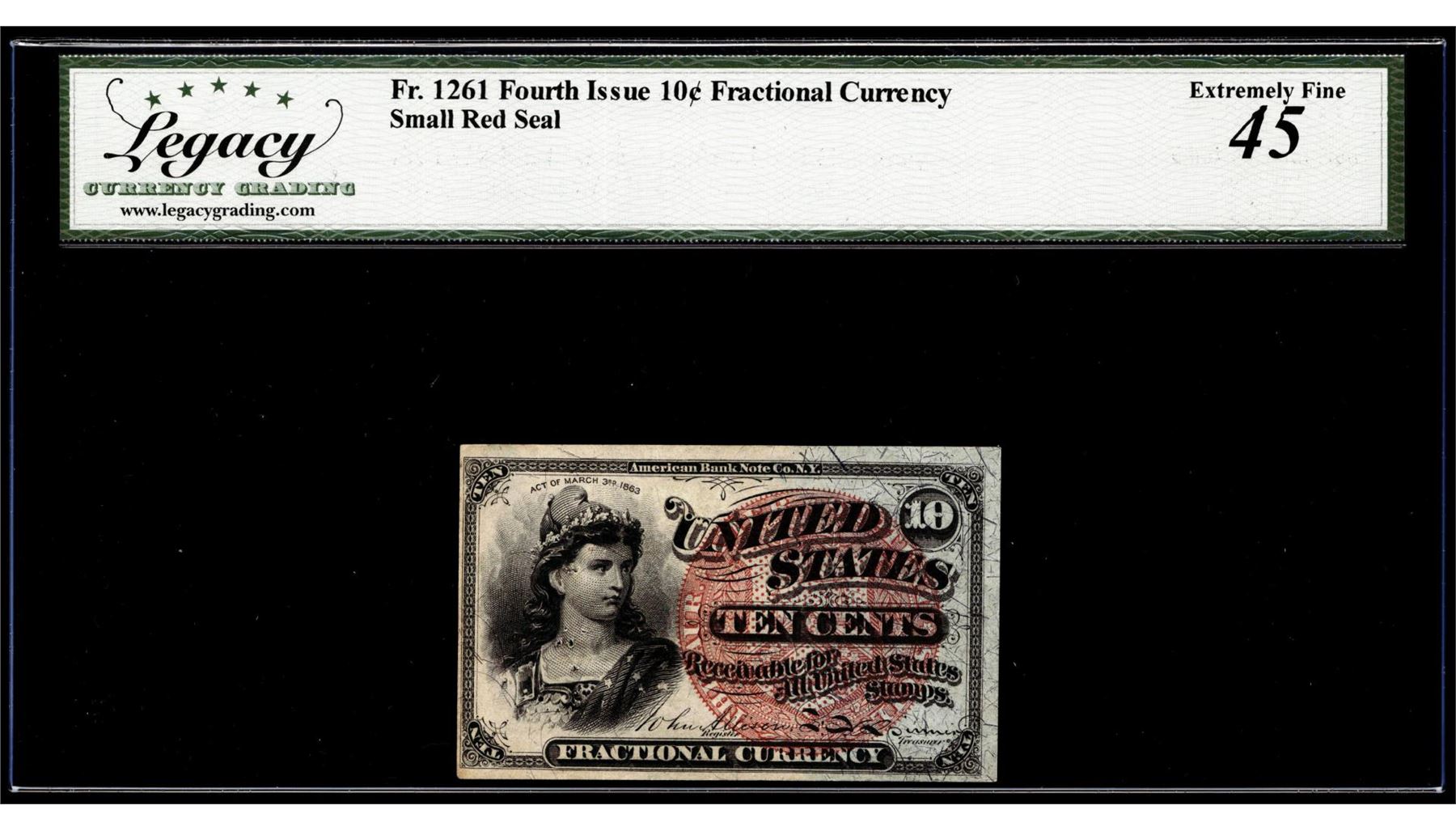 One 1863 Fourth Issue 10 Cents Fractional Currency Note Fr.1261 Legacy Extremely Fine 45. Legacy Graded.