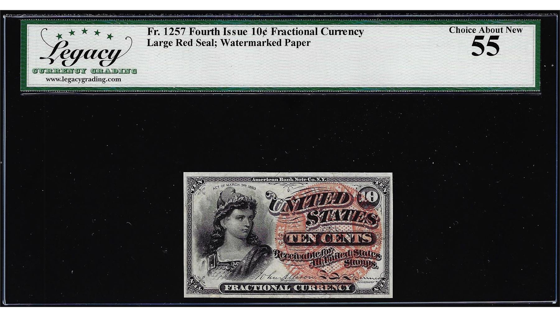 One 1863 Fourth Issue 10 Cents Fractional Note Fr.1257 Legacy Choice About New 55. Legacy Graded.