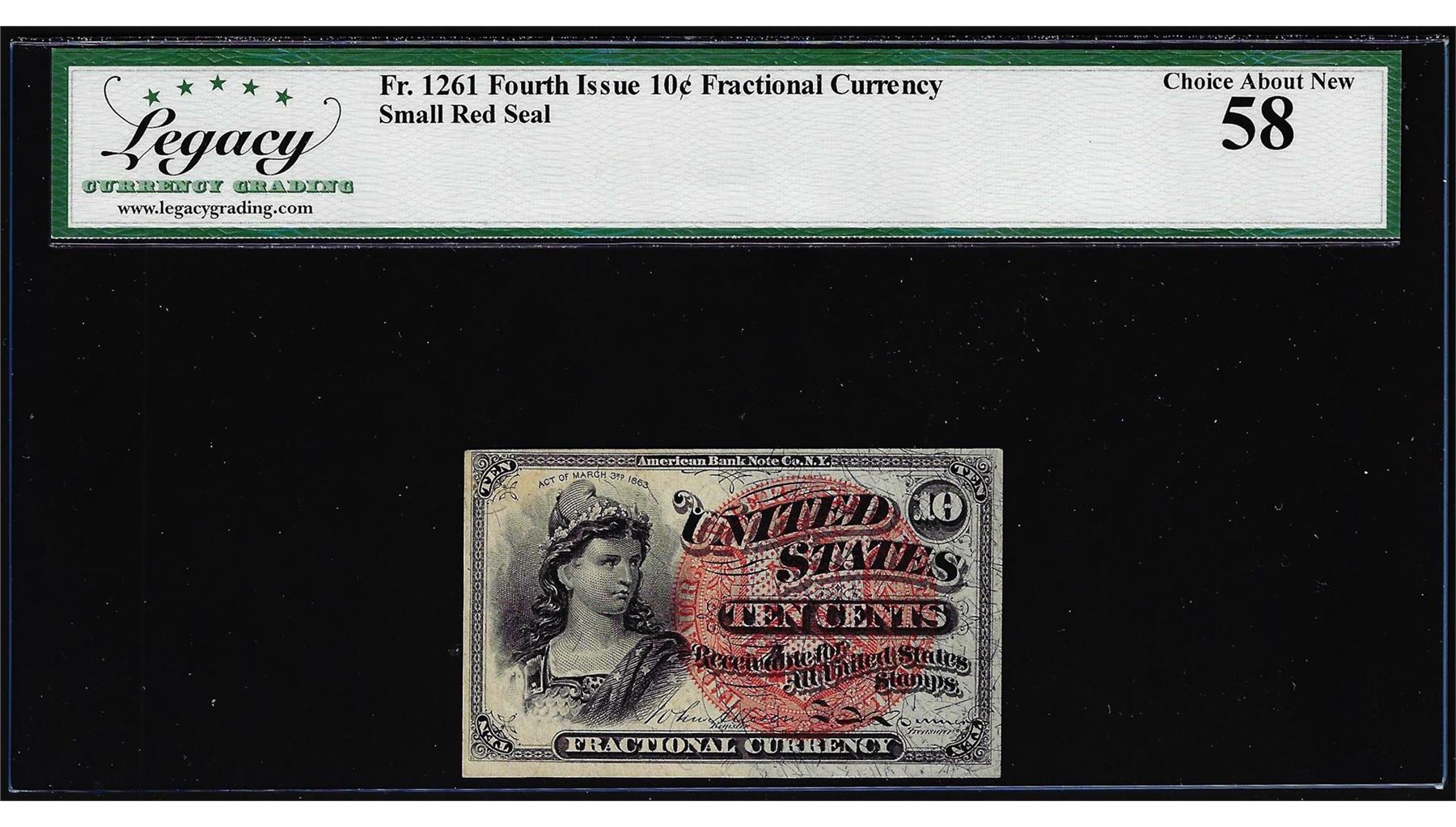 One 1863 Fourth Issue 10 Cents Fractional Note Fr.1261 Legacy Choice About New 58. Legacy Graded.