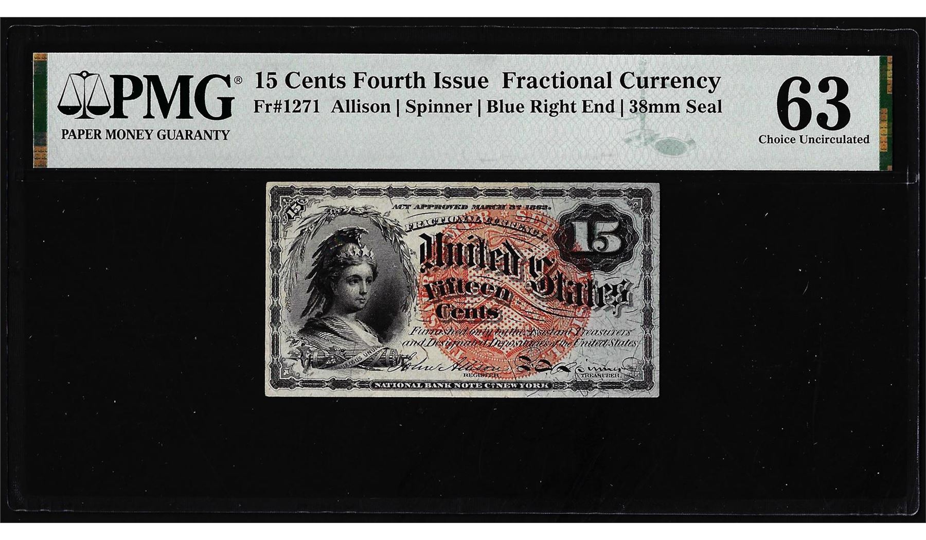 One 1863 Fourth Issue 15 Cents Fractional Currency Note Fr.1271 PMG Ch. Uncirculated 63. PMG Certified.
