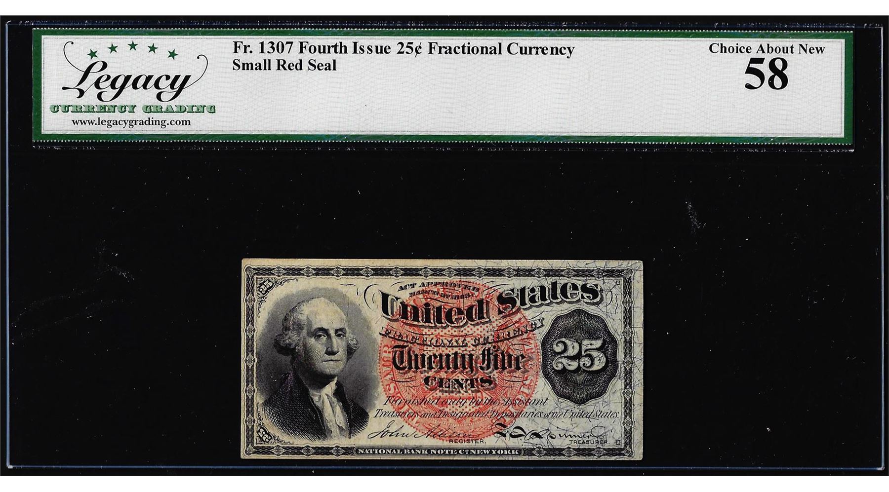 One 1863 Fourth Issue 25 Cent Fractional Currency Note Fr.1307 Legacy Choice About New 58. Legacy Graded.