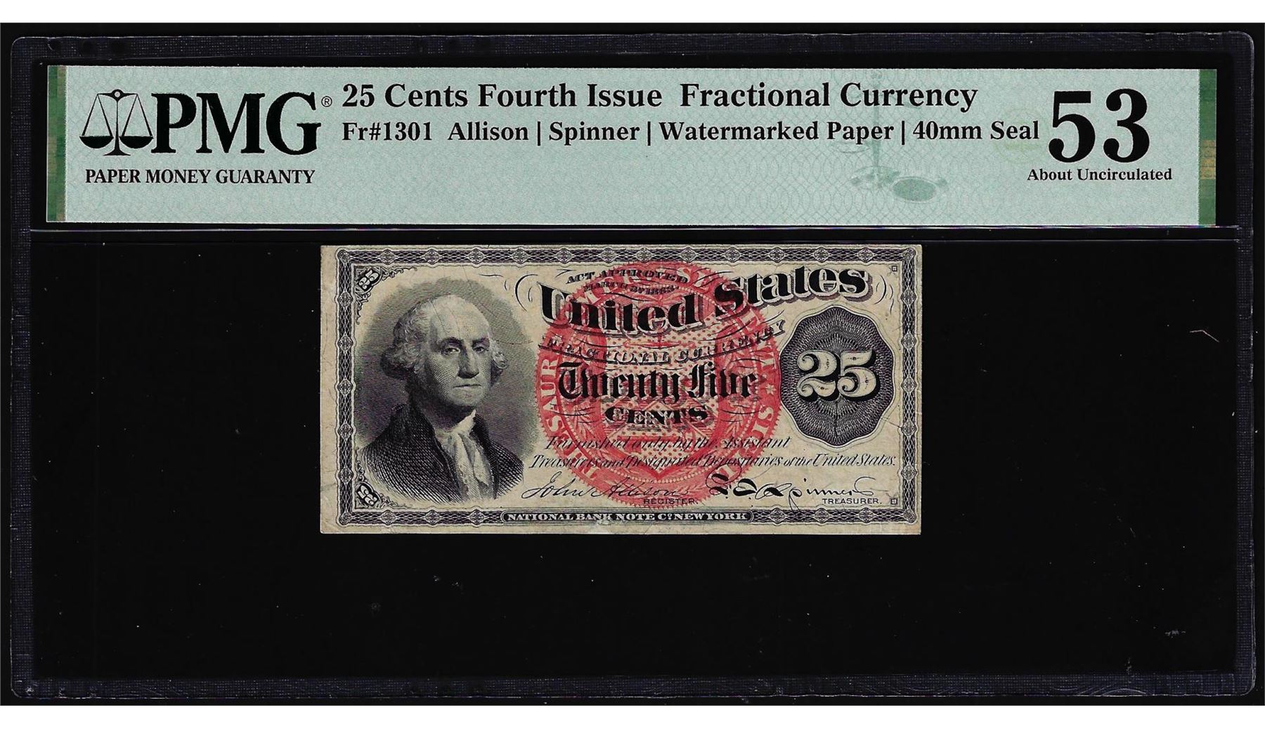 One 1863 Fourth Issue 25 Cents Fractional Currency Note Fr.1301 PMG About Uncirculated 53. PMG Certified.