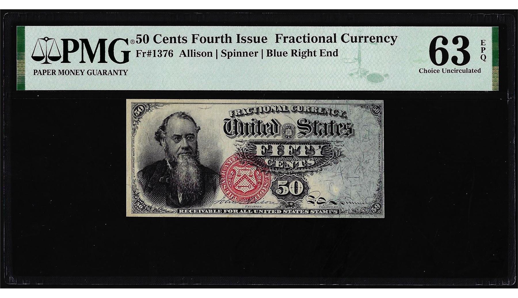 One 1863 Fourth Issue 50 Cents Fractional Currency Note Fr.1376 PMG Ch. Uncirculated 63EPQ. PMG Certified.